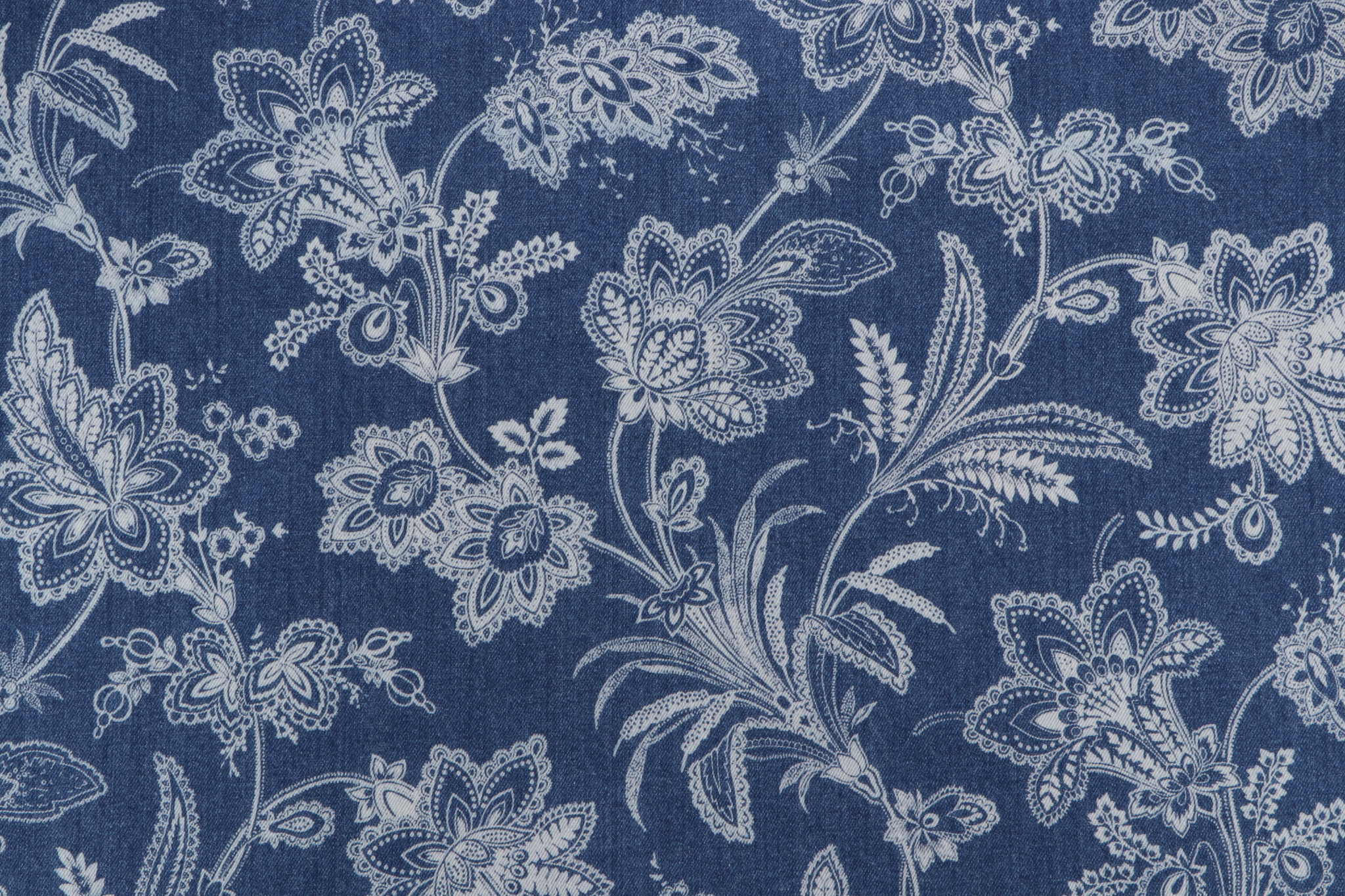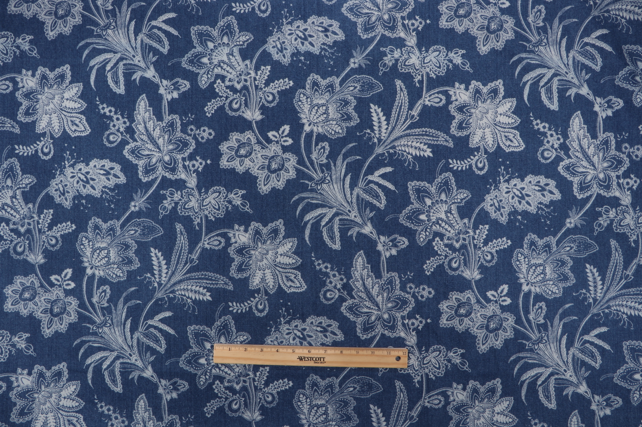 Waverly Follow The Trail Printed Cotton Denim Decorator Fabric in Denim is a remnant, which is sold as a whole piece.