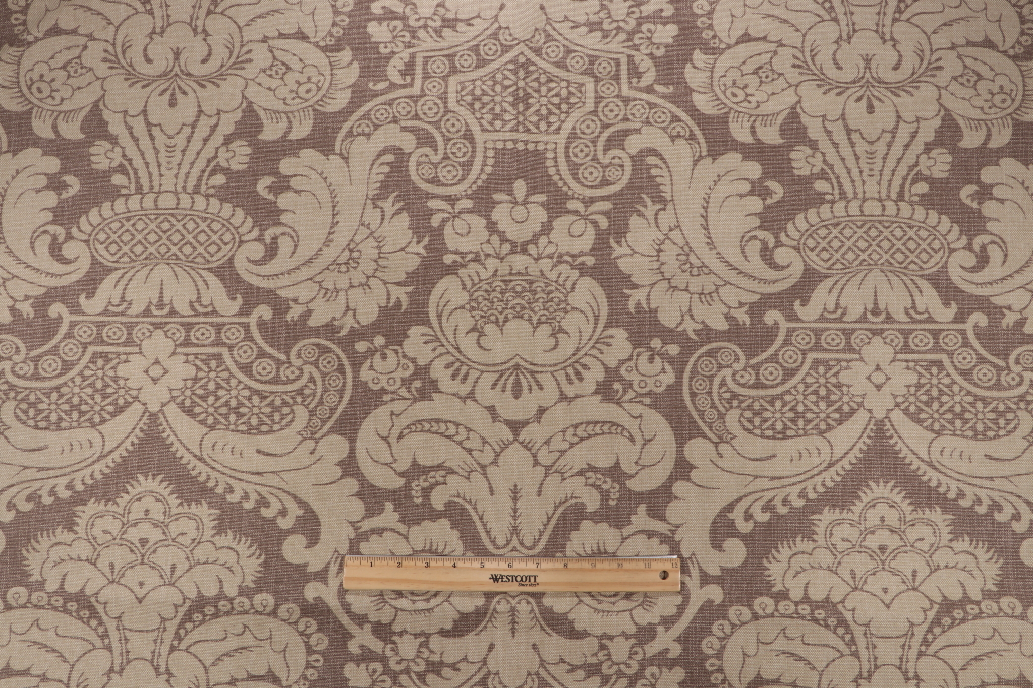 Damask Printed Linen Drapery Fabric in Cocoa is a remnant, which is sold as a whole piece.