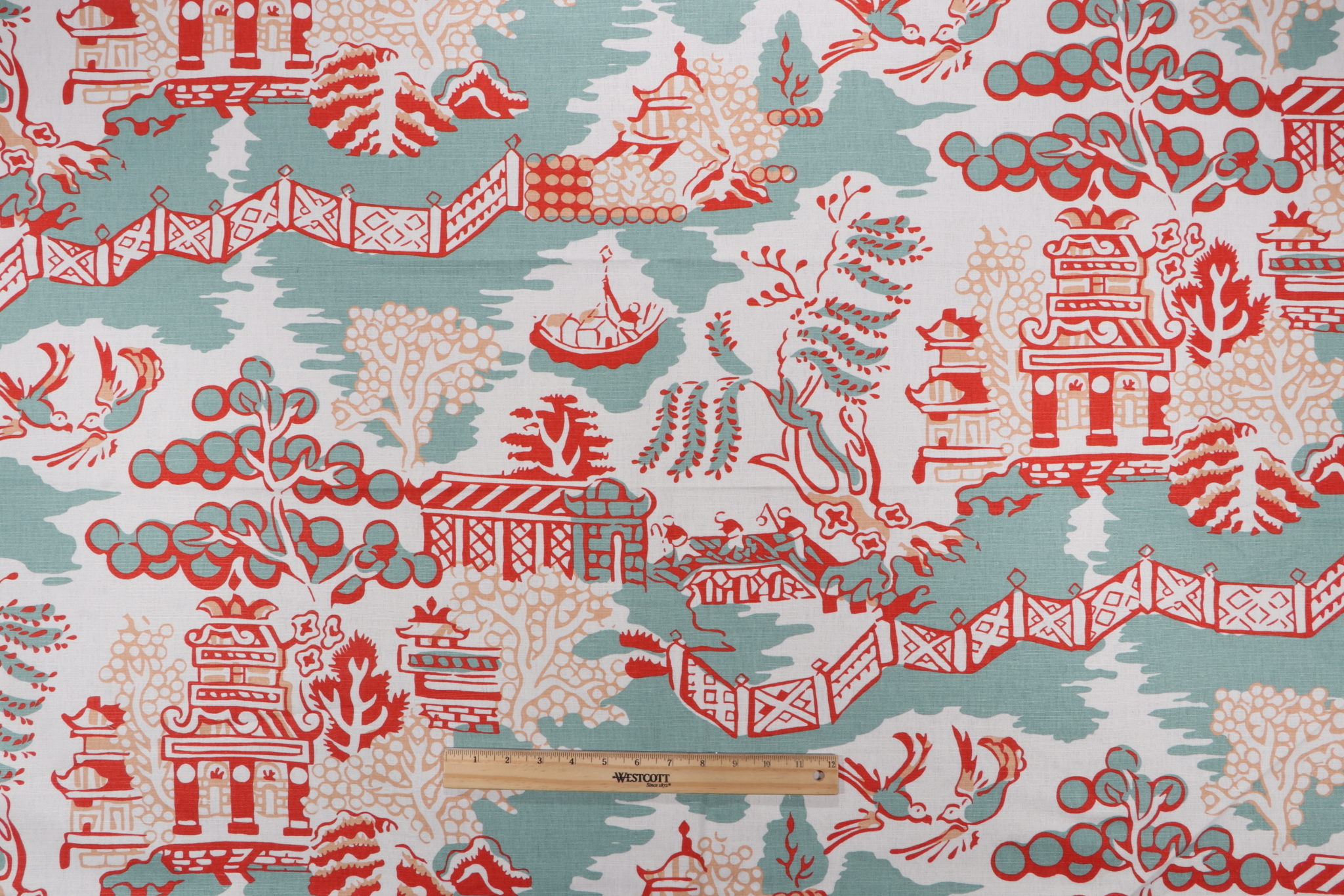 1 Yards Anna French Luzon F936107 Printed Linen Blend Drapery Fabric in Aqua and Coral for Thibaut Details