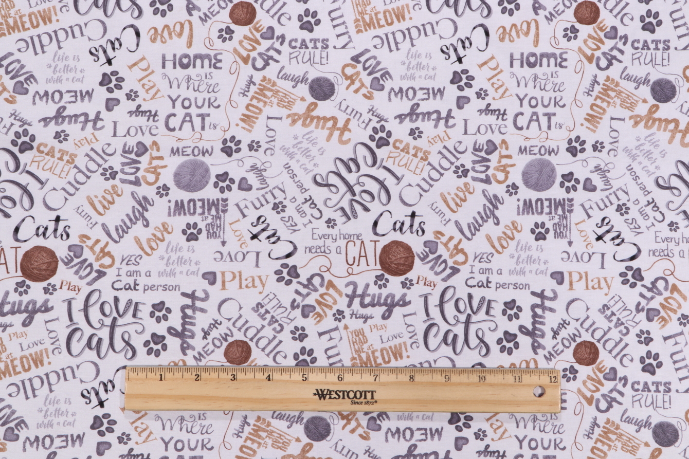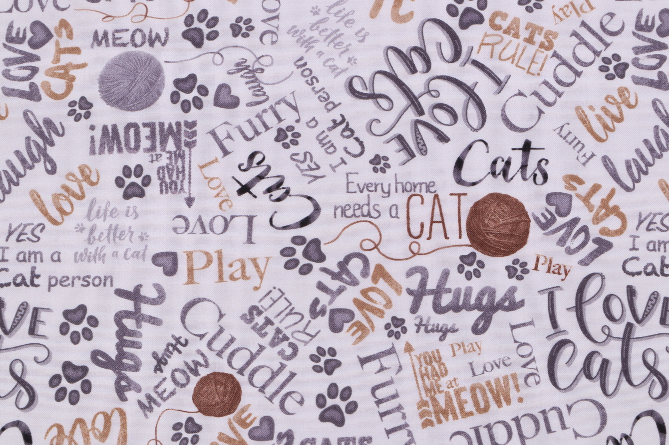 Timeless Treasures Quirky Cats - Ball Of Yarn and Text Printed Cotton Craft Fabric in Natural is a remnant, which is sold as a whole piece.
