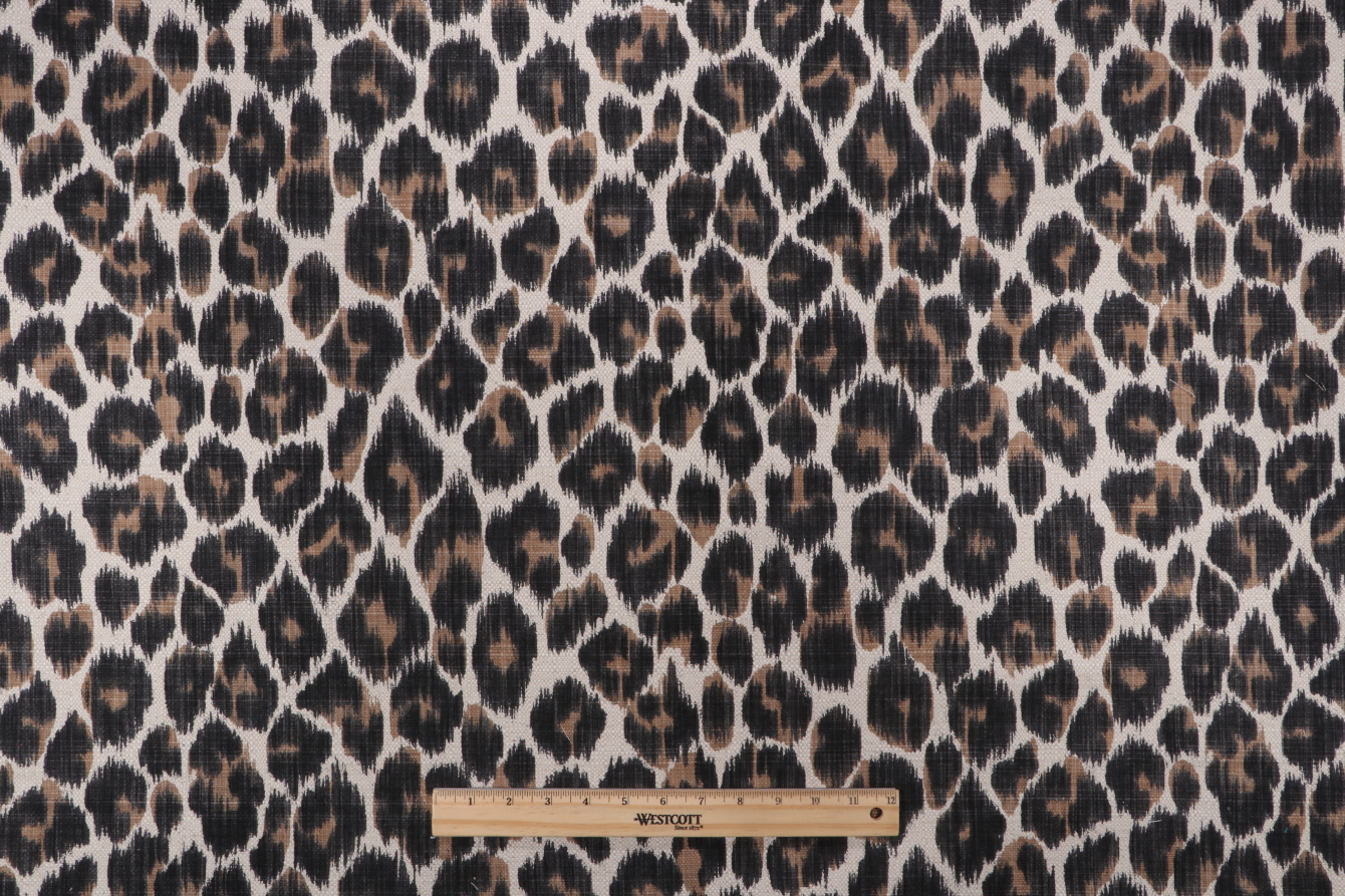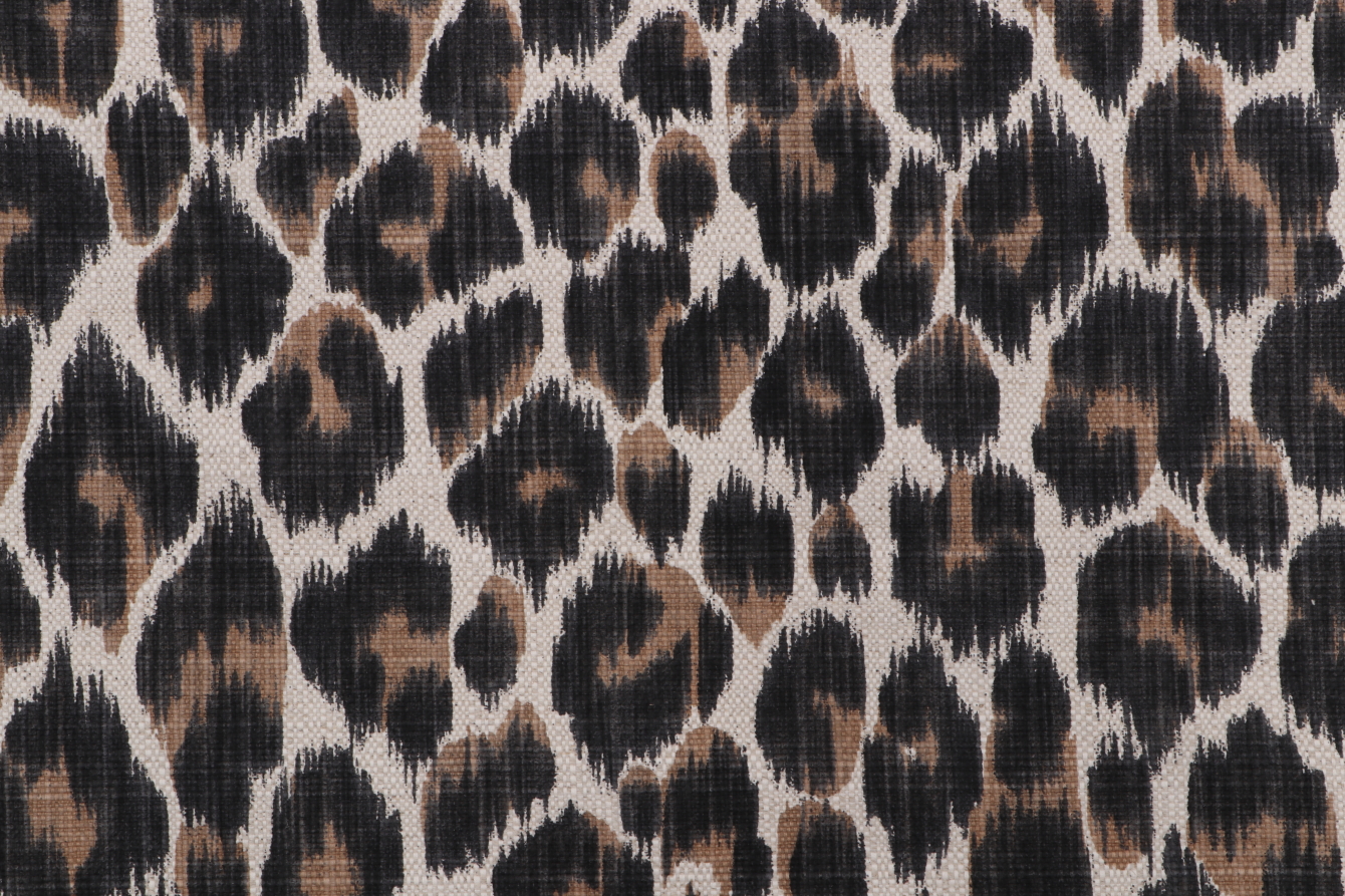 Vilber Leopardo 22.A/01 brings the drama of a classic animal motif to a refined, linen-look ground. The print showcases bold, irregular leopard rosettes rendered in deep black with warm brown accents, creating rich dimension without shine. Softly feathered, painterly edges give the spots movement, while subtle tonal strié within the darker areas adds depth and a touch of texture. The warm stone-beige background lends a sophisticated contrast and allows the motif to read clearly from near or far. This is an allover, non-directional layout designed to flow continuously across yardage so seams and joins visually blend. The underlying weave presents a fine, natural texture that reads as matte and tactile, enhancing the organic character of the pattern. Crisp registration keeps the outlines clean, and the color palette balances espresso black, sable brown, and camel against a neutral ground for a timeless, versatile look. As a printed drapery-weight fabric, it offers a stable hand with a graceful fall and a smooth, dry touch.