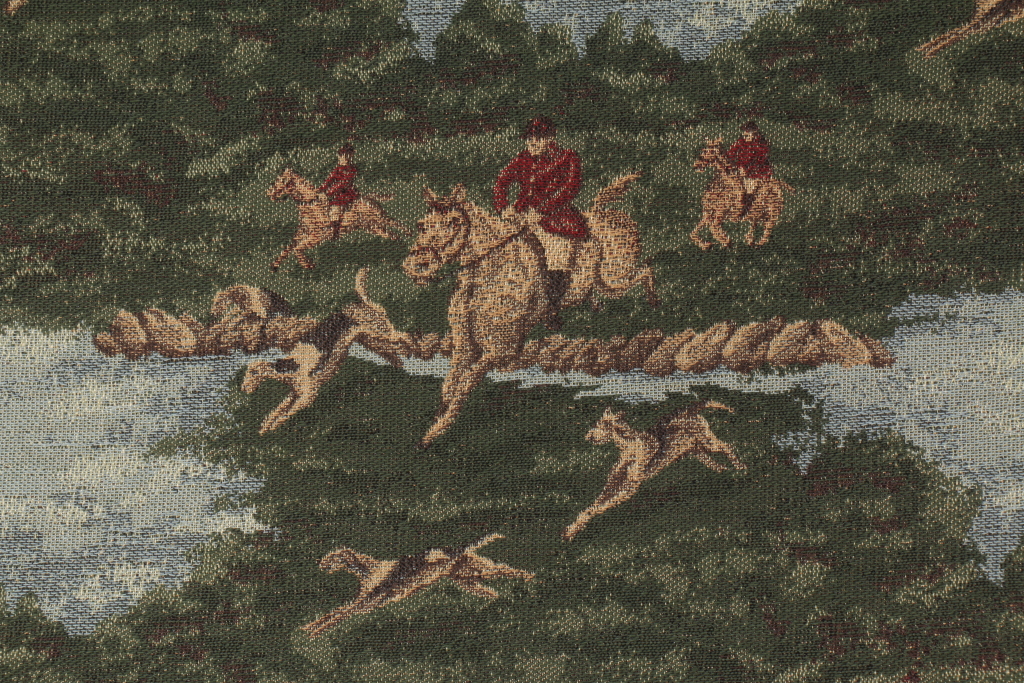 3.7 Yards Fox Hunt Tapestry Upholstery Fabric in Hunter. This high end woven upholstery weight fabric is suited for uses requiring a more durable designer fabric. Uses include any upholstery project, sofas, chairs, dining chairs, pillows, certain types of window treatments, handbags and craft projects.