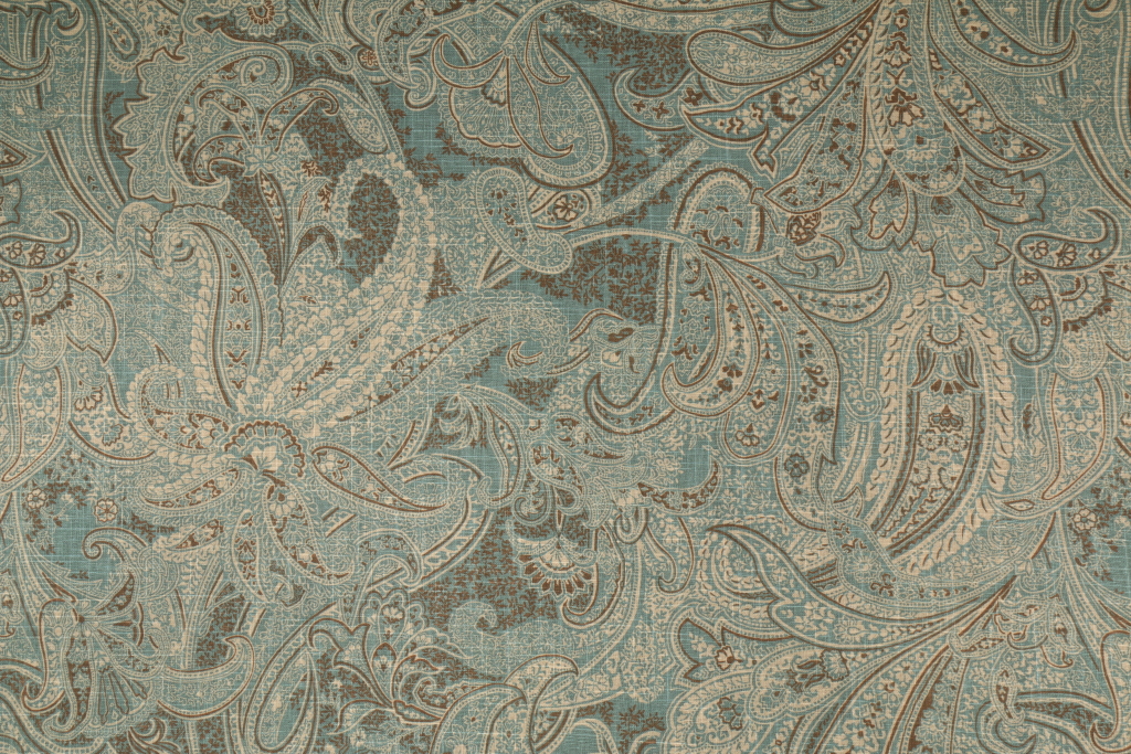 Portfolio Paisley Printed Linen Blend Drapery Fabric in teal. This printed fabric is perfect for window treatments, decorative pillows, handbags, light duty upholstery applications and almost any craft project. This fabric has a soft workable feel yet is stable and durable.