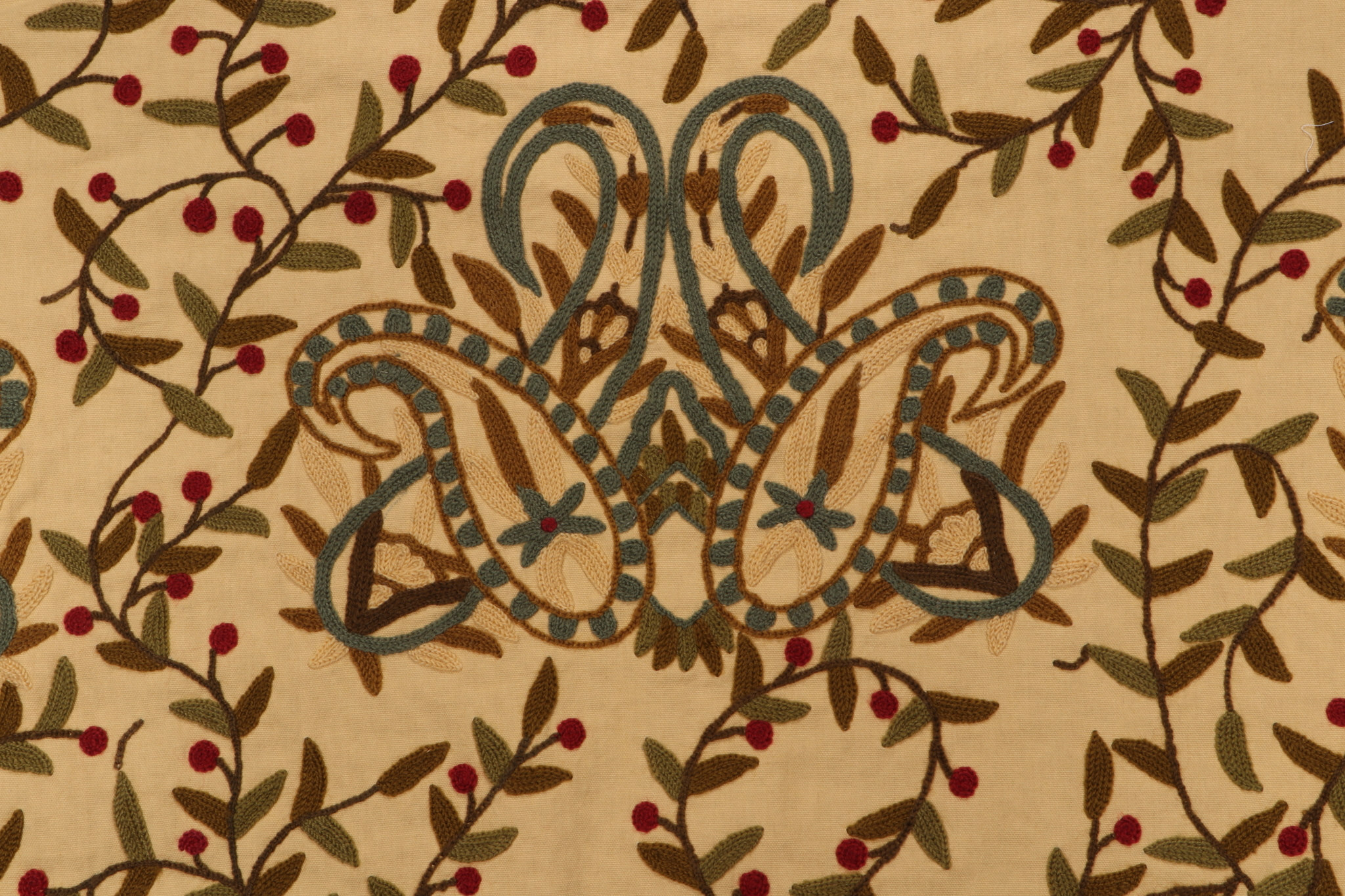 Offering 2.5 yards of Durjaya Crewel, a fine embroidered drapery fabric designed by Scalamandre. This fabric is suitable for short curtains, decorative tiebacks, or smaller window treatments. Note: If you are unsure about the suitability of this fabric for your specific use case please contact us prior to ordering.