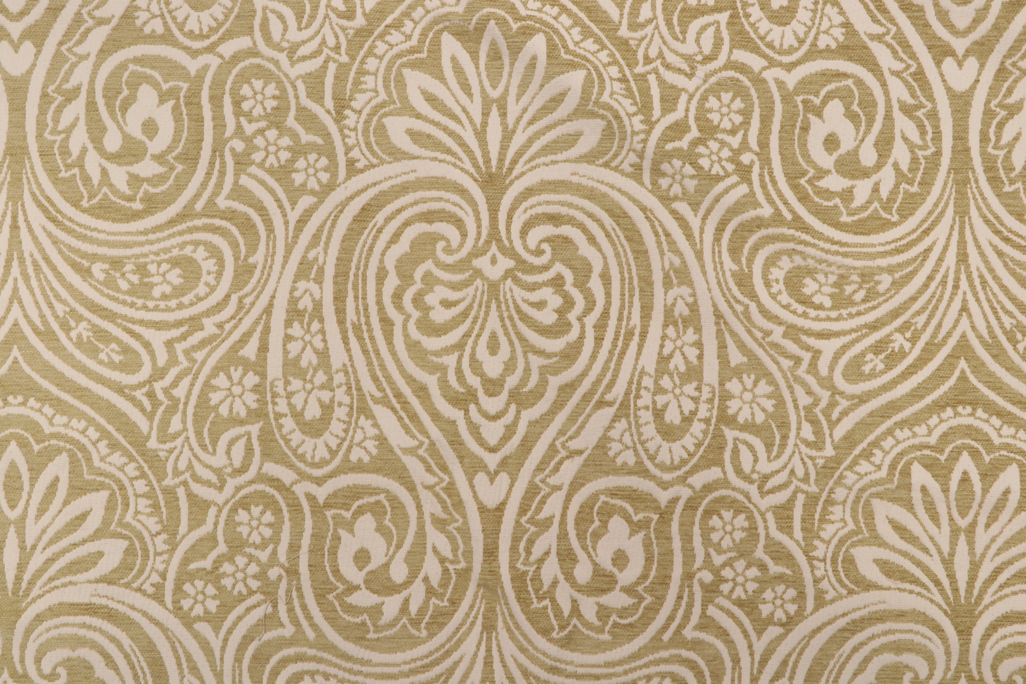 Scalamandre Paisley Chenille Damask Upholstery Fabric in Willow is a remnant. Fabric remnants refer to leftover pieces of fabric from production runs at manufacturing sites or pieces that remain from by the yard stock. The lengths of these remnants can vary from a few inches to several yards and are typically sold at a reduced price, since they represent remaining inventory.