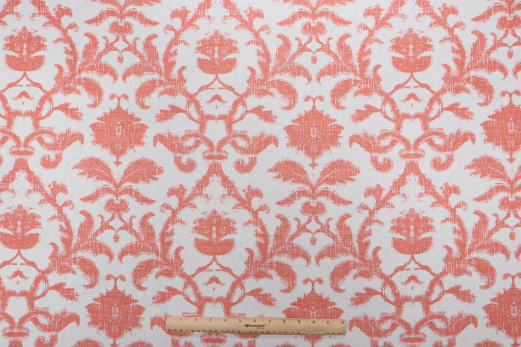 Thibaut Anita Damask F98838 Printed Linen Blend Drapery Fabric in Red is a remnant. Fabric remnants refer to leftover pieces of fabric from production runs at manufacturing sites or pieces that remain from by the yard stock. The lengths of these remnants can vary from a few inches to several yards and are typically sold at a reduced price, since they represent remaining inventory.