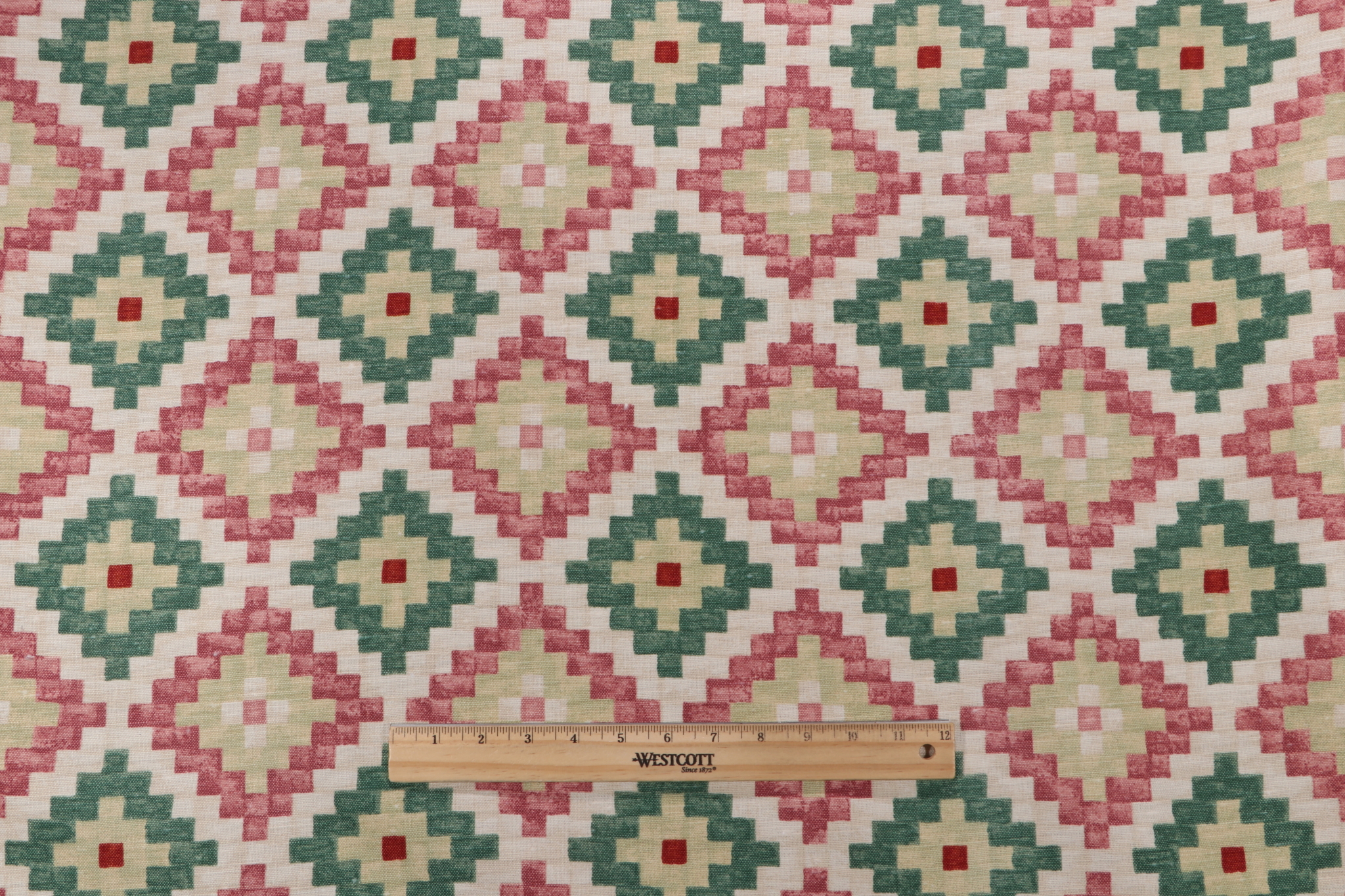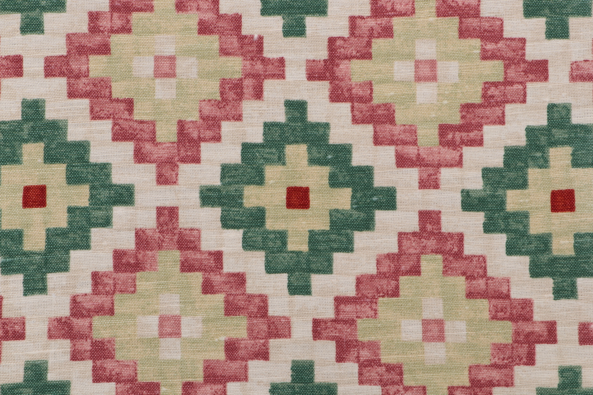 Grey Watkins Topkapi Printed Linen Drapery Fabric in Green/Coral is a remnant, which is sold as a whole piece.