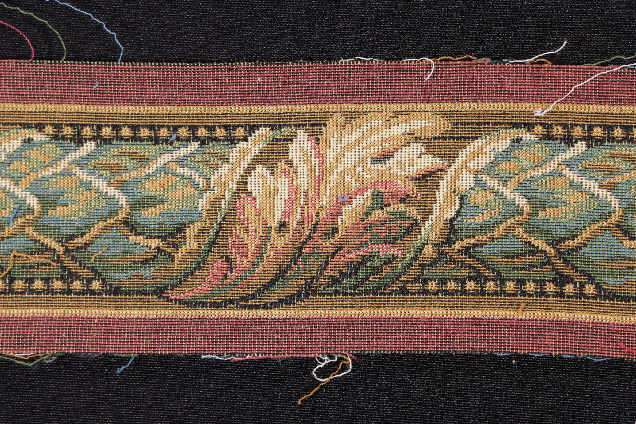 Scalamandre Border Nine 3'' Tapestry Border Fabric in Rose/Mustard & Green is a remnant. Fabric remnants refer to leftover pieces of fabric from production runs at manufacturing sites or pieces that remain from by the yard stock. The lengths of these remnants can vary from a few inches to several yards and are typically sold at a reduced price, since they represent remaining inventory.