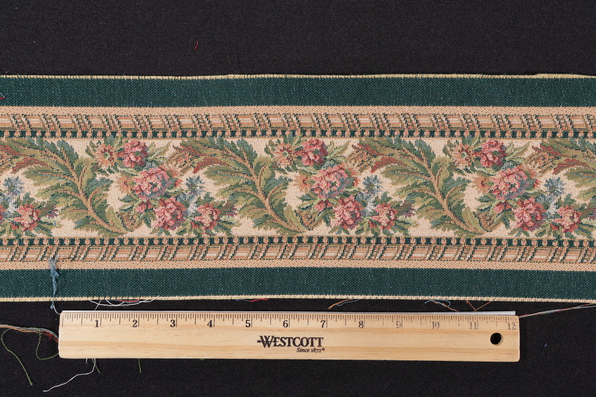 Scalamandre PM Border Seven 4.5'' Tapestry Border Fabric in Green,Cream,Rose is a remnant. Fabric remnants refer to leftover pieces of fabric from production runs at manufacturing sites or pieces that remain from by the yard stock. The lengths of these remnants can vary from a few inches to several yards and are typically sold at a reduced price, since they represent remaining inventory.