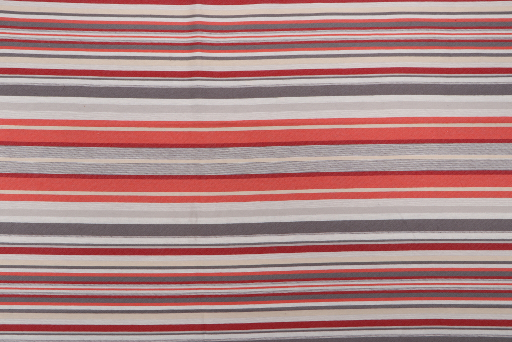 Woven Polyester Stripe Outdoor Fabric in Grey/Brick is a remnant. Fabric remnants refer to leftover pieces of fabric from production runs at manufacturing sites or pieces that remain from by the yard stock. The lengths of these remnants can vary from a few inches to several yards and are typically sold at a reduced price, since they represent remaining inventory.