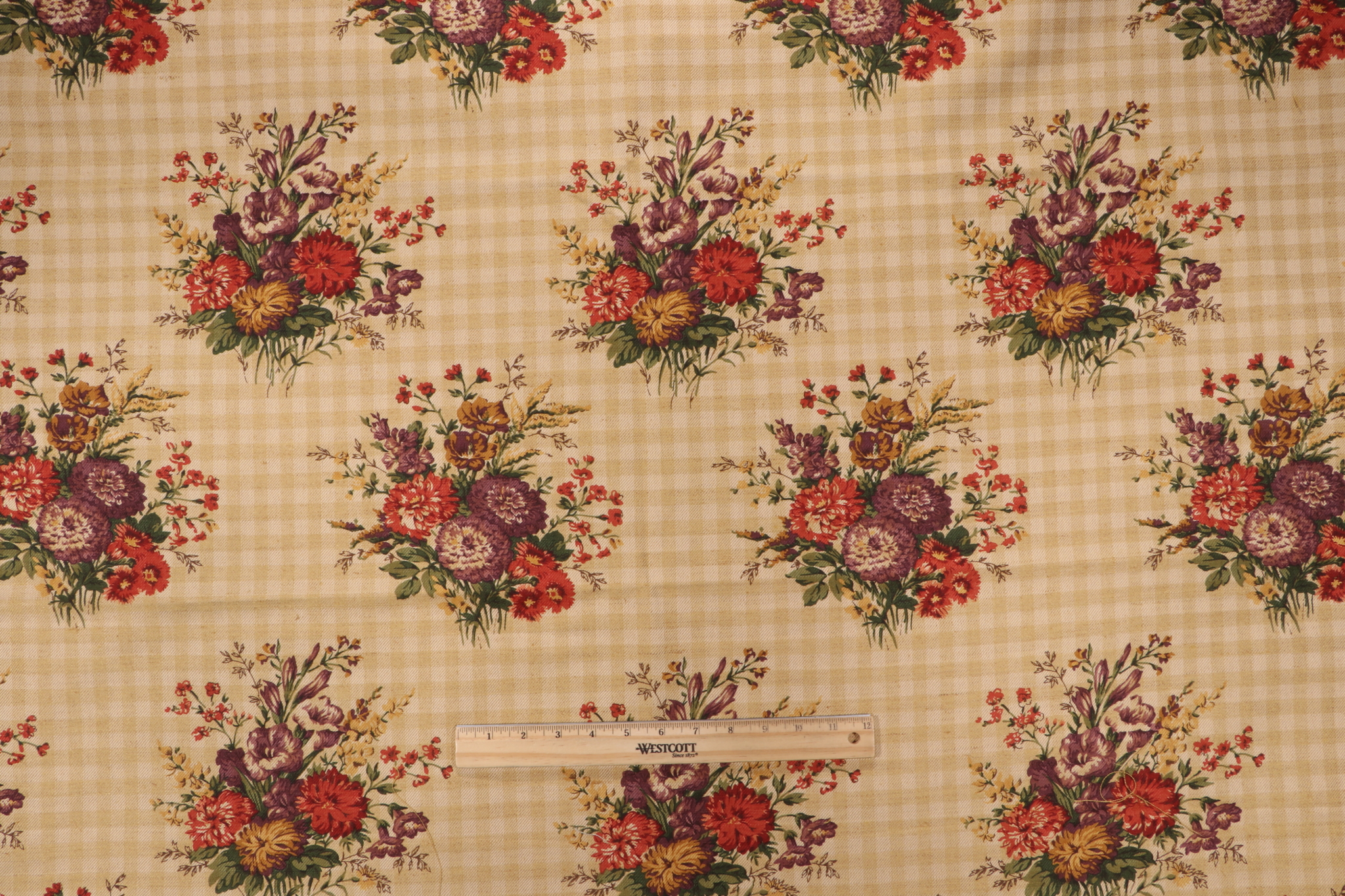 Scalamandre Victorian Posy Printed Drapery Fabric in Purple/Red/Gold is a remnant. Fabric remnants refer to leftover pieces of fabric from production runs at manufacturing sites or pieces that remain from by the yard stock. The lengths of these remnants can vary from a few inches to several yards and are typically sold at a reduced price, since they represent remaining inventory.