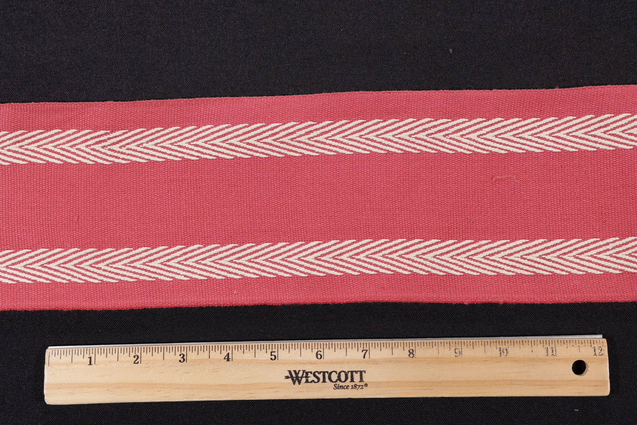 Scalamandre Narrow Chevron Border 5'' Woven Border Fabric in Red is a remnant. Fabric remnants refer to leftover pieces of fabric from production runs at manufacturing sites or pieces that remain from by the yard stock. The lengths of these remnants can vary from a few inches to several yards and are typically sold at a reduced price, since they represent remaining inventory.
