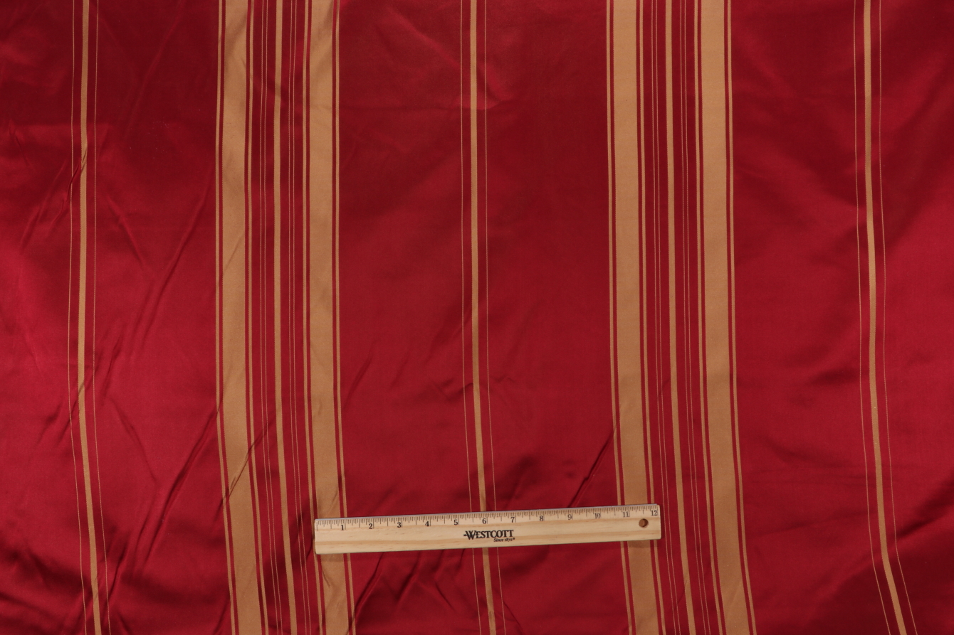 Scalamandre Cecilia Silk Decorator Fabric in Gold/Wine is a remnant. Fabric remnants refer to leftover pieces of fabric from production runs at manufacturing sites or pieces that remain from by the yard stock. The lengths of these remnants can vary from a few inches to several yards and are typically sold at a reduced price, since they represent remaining inventory.