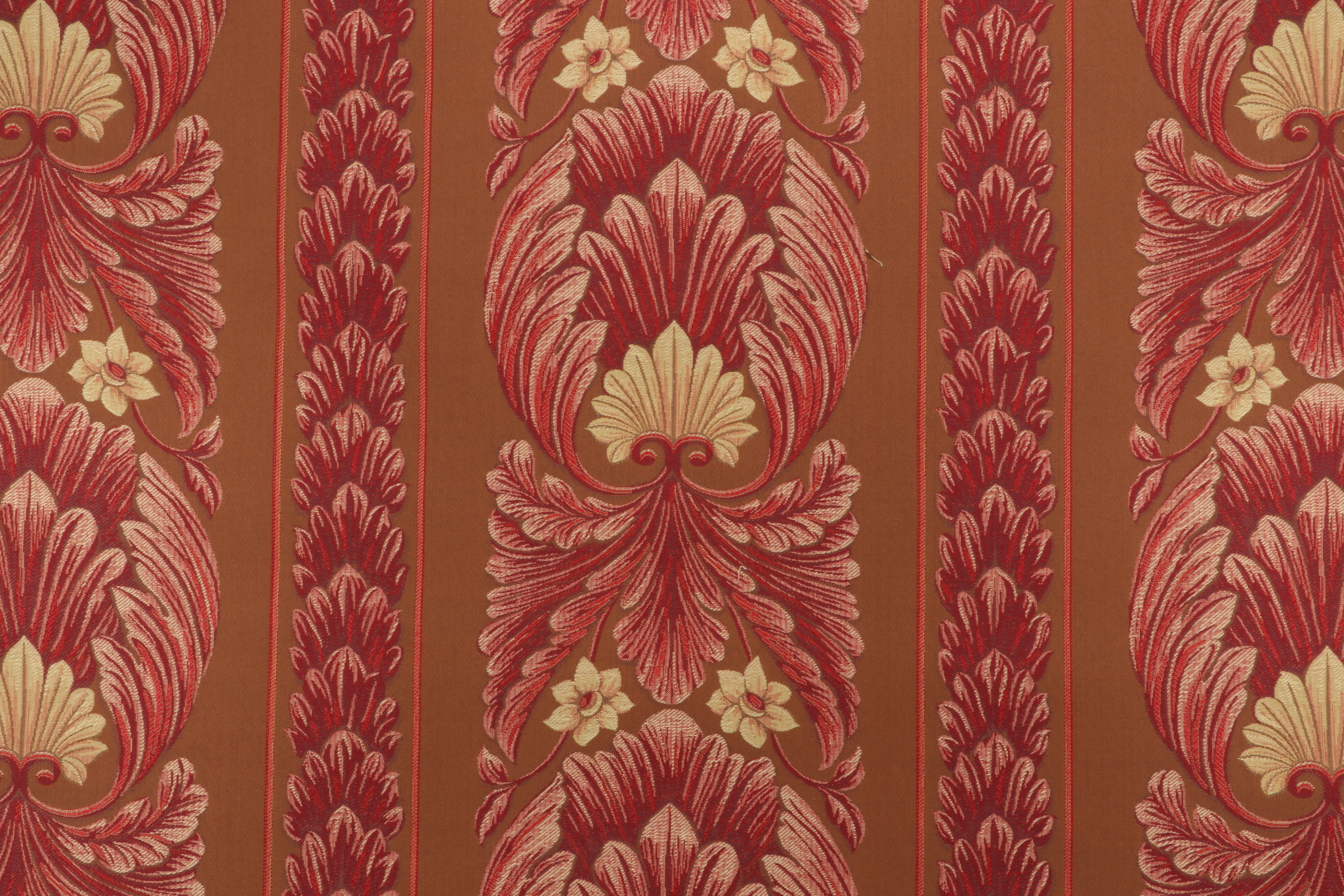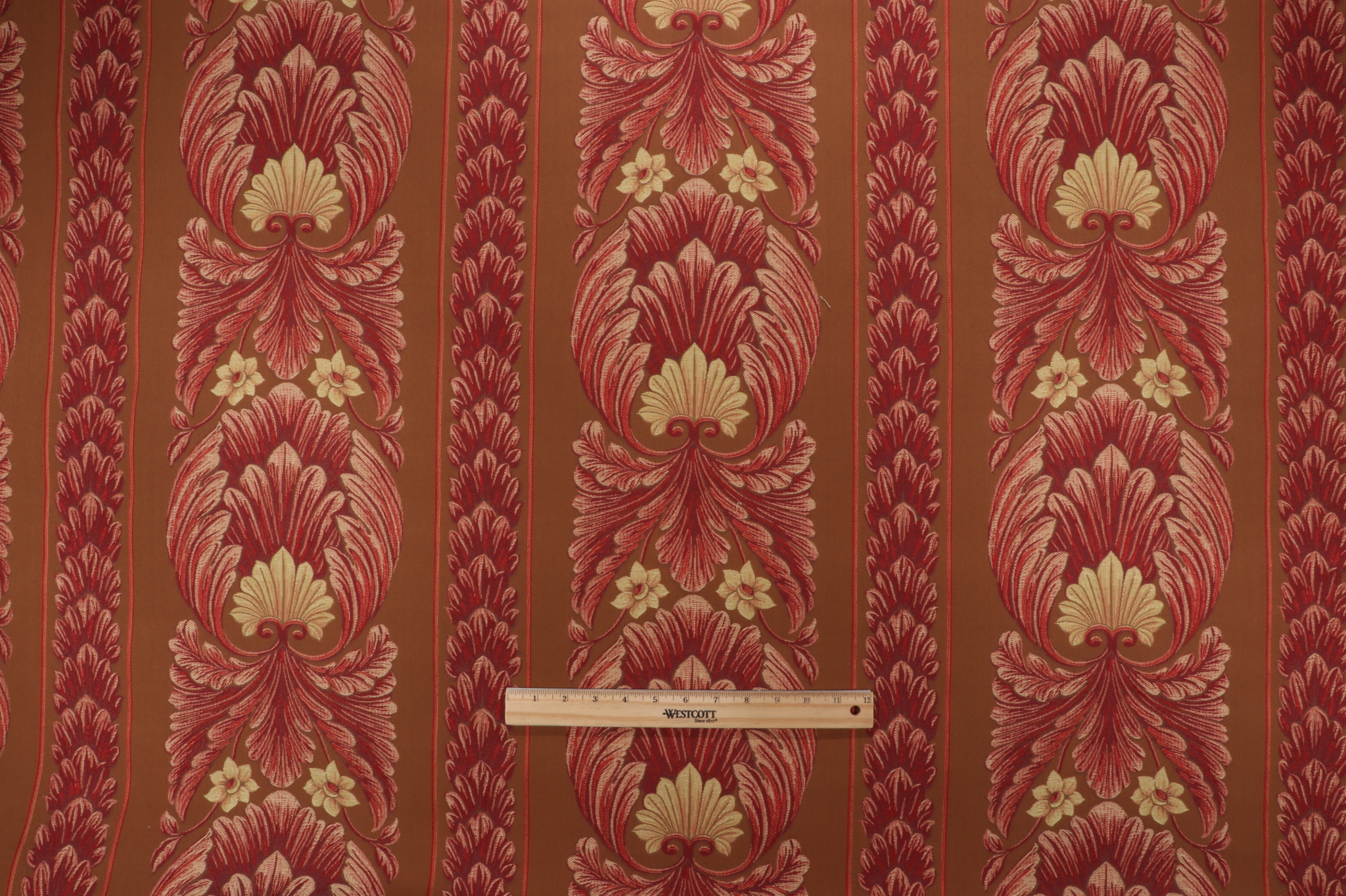 Grey Watkins Vincent Tapestry Upholstery Fabric in Tan/Red for Scalamandre is a remnant. Fabric remnants refer to leftover pieces of fabric from production runs at manufacturing sites or pieces that remain from by the yard stock. The lengths of these remnants can vary from a few inches to several yards and are typically sold at a reduced price, since they represent remaining inventory.