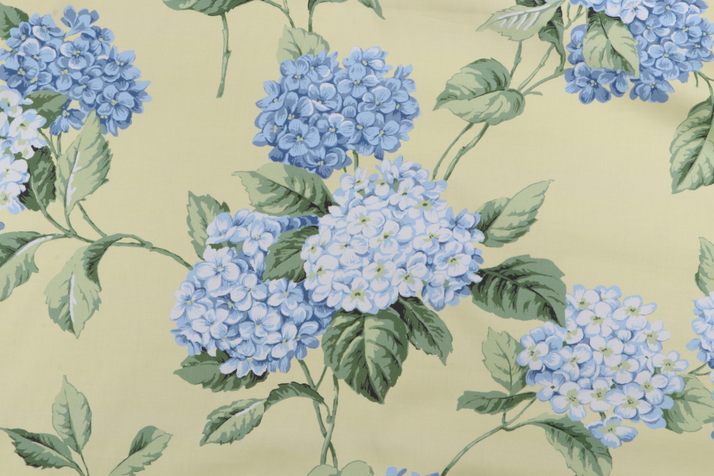 13 Yards Thibaut Hydrangea F93906 Printed Cotton Drapery Fabric in Blue on Yellow Details