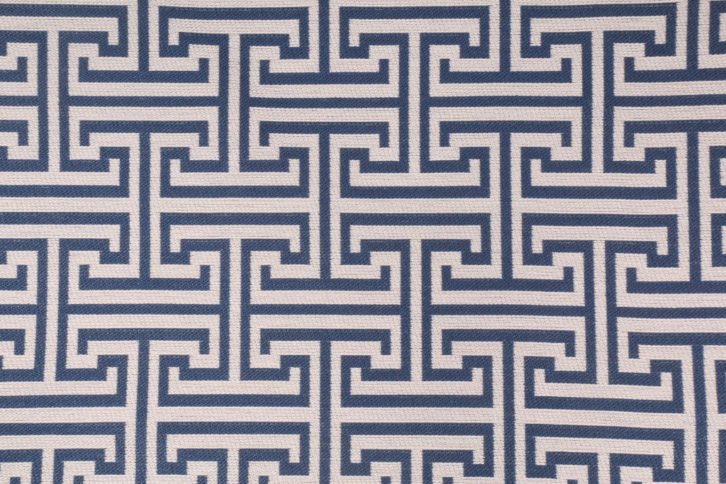 Couture Textiles Key Maze Upholstery Fabric in Marine. This high end woven upholstery weight fabric is suited for uses requiring a more durable designer fabric. Uses include any upholstery project, sofas, chairs, dining chairs, pillows, certain types of window treatments, handbags and craft projects.