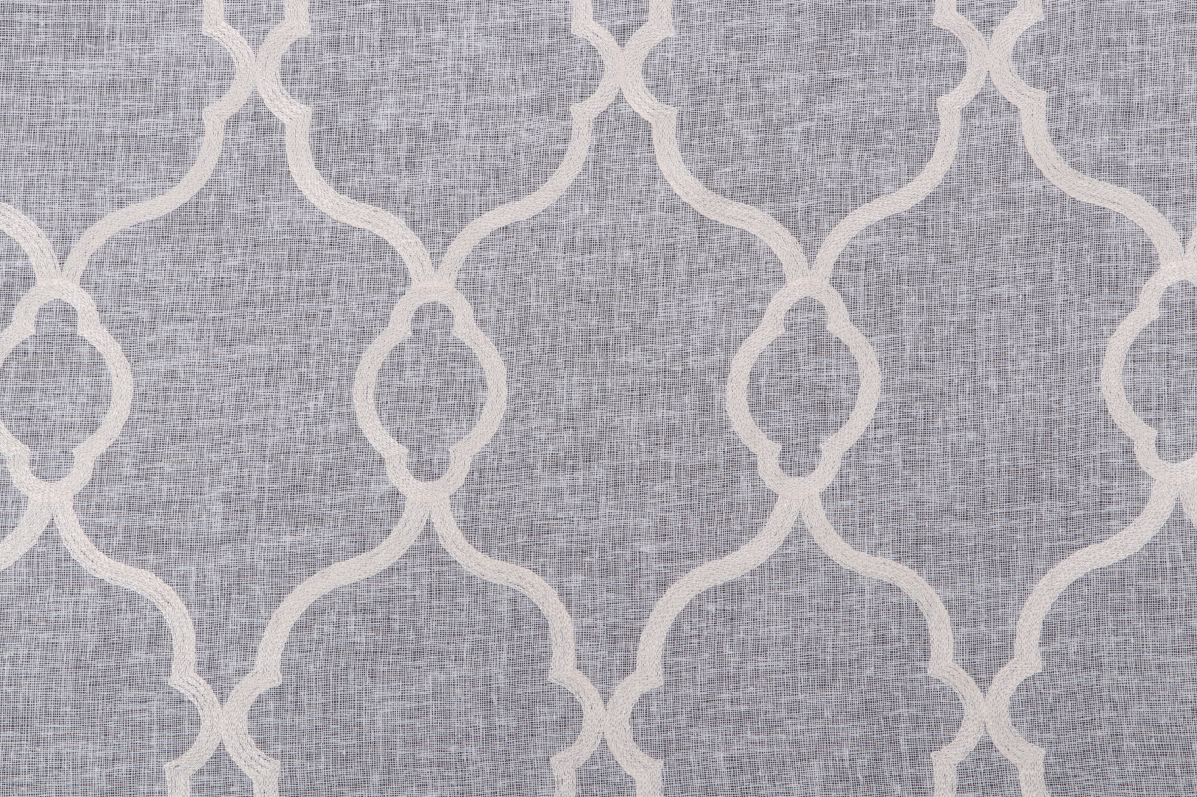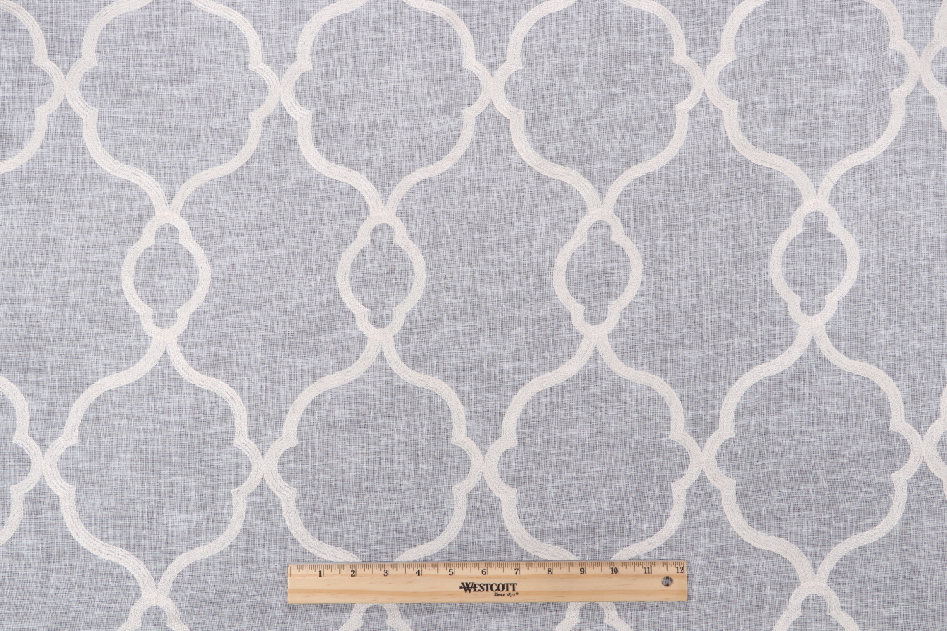 This listing features 7.38 yards of Angela sheer embroidered drapery fabric, perfect for various applications. This premium textile brings sophistication and quality to your high-end design projects. Perfectly balanced with hues of dark gray, silver, light slate gray, gray, and gainsboro, this fabric will surely enhance your application. With this amount, you can create 2 medium-length drapery panels (50 inches wide and 84 inches long) for standard 7-foot windows. Note: If you are unsure about the suitability of this fabric for your specific use case please contact us prior to ordering.
