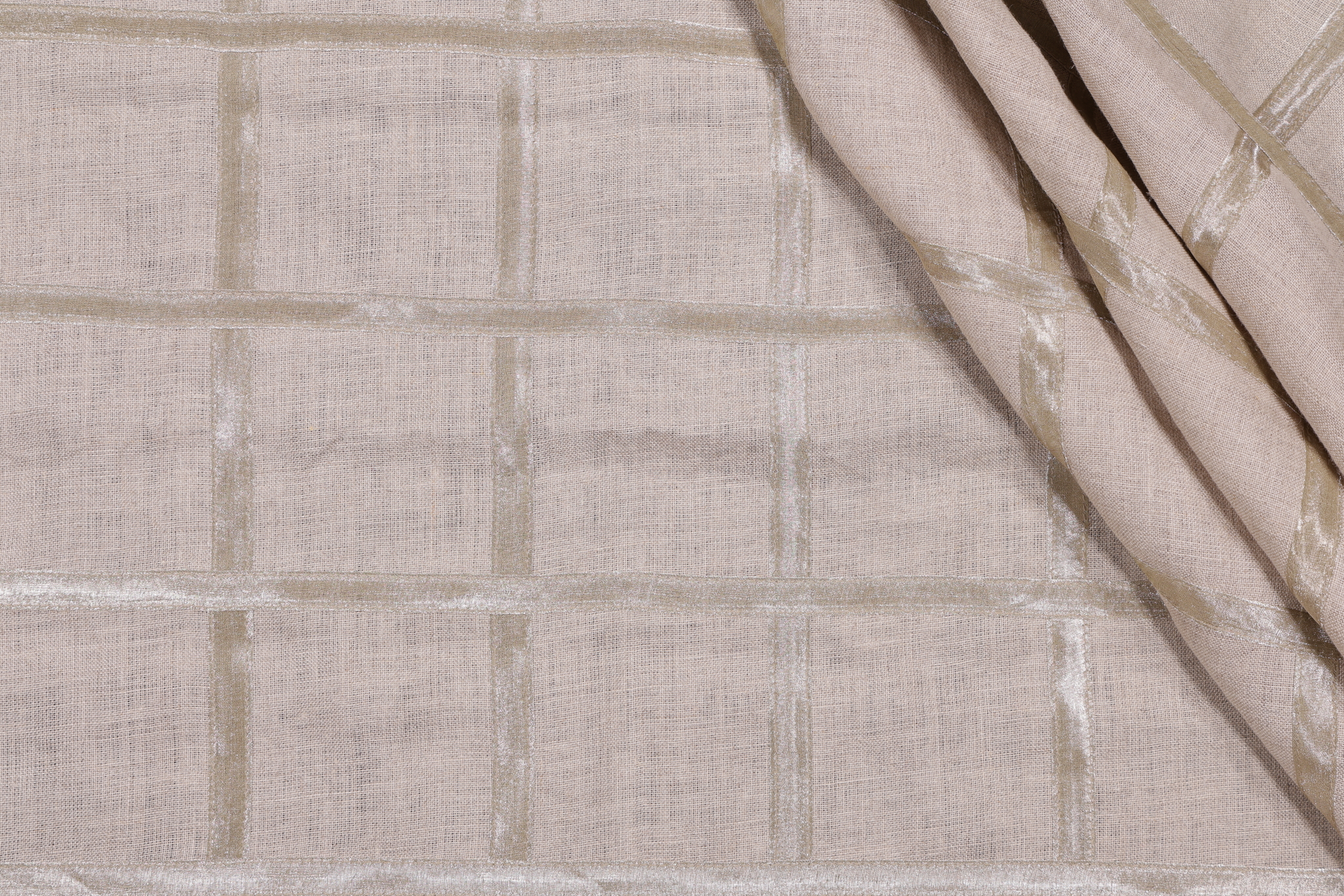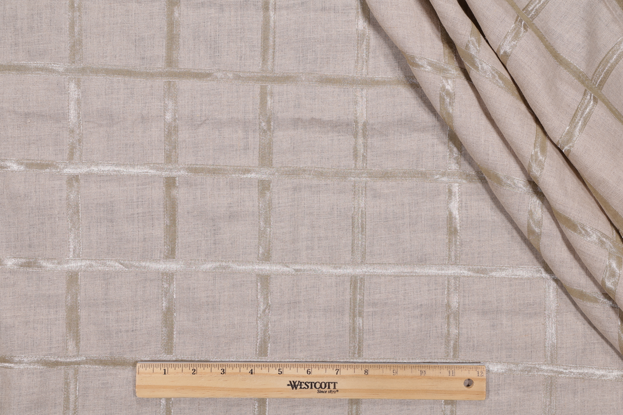 Platinum Box Sheer Applique Drapery Fabric in Platinum is a remnant. Fabric remnants refer to leftover pieces of fabric from production runs at manufacturing sites or pieces that remain from by the yard stock. The lengths of these remnants can vary from a few inches to several yards and are typically sold at a reduced price, since they represent remaining inventory.