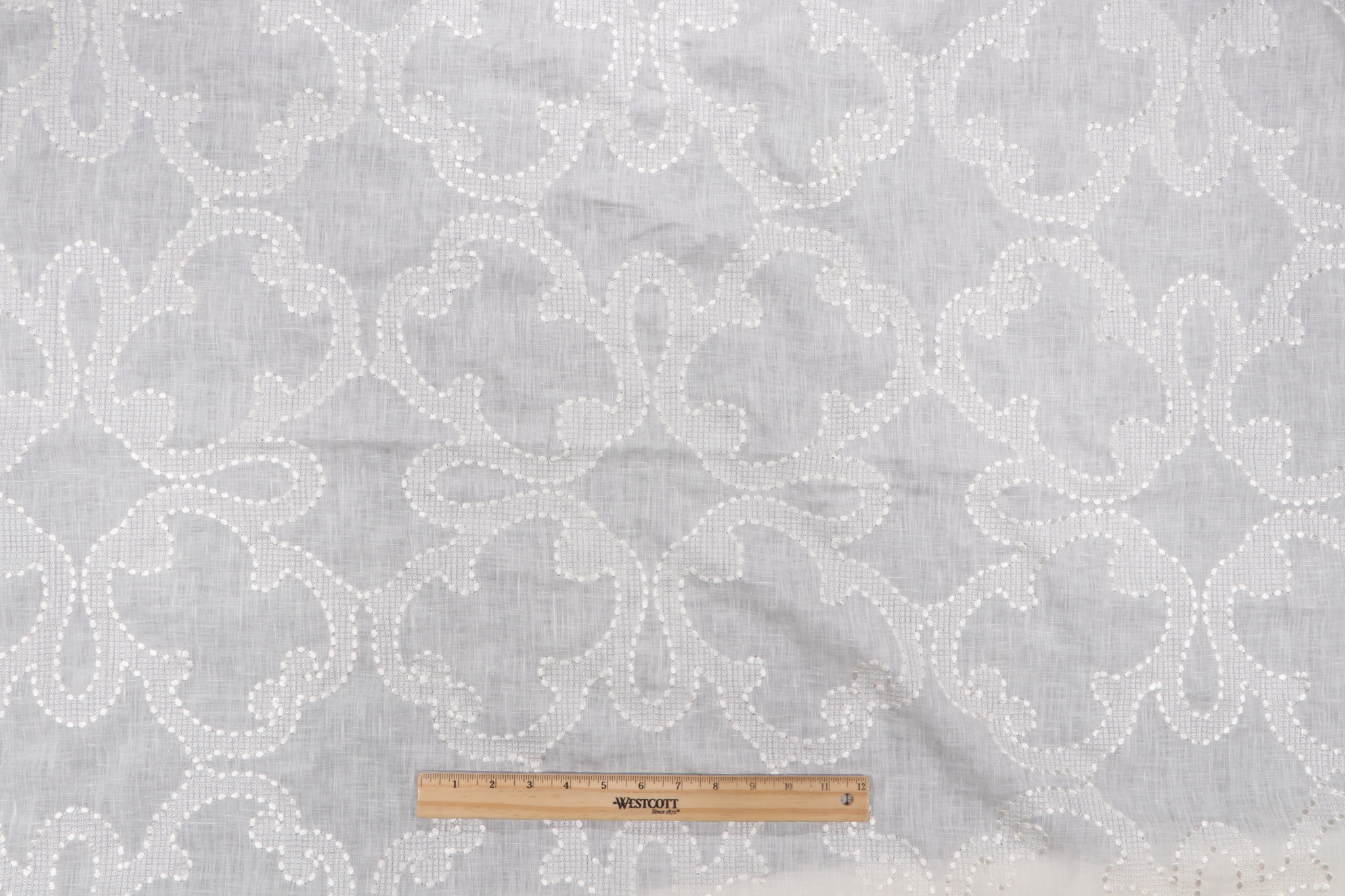 Thibaut Park Slope W764118 Sheer Embroidered Linen Drapery Fabric in White is a remnant, which is sold as a whole piece.