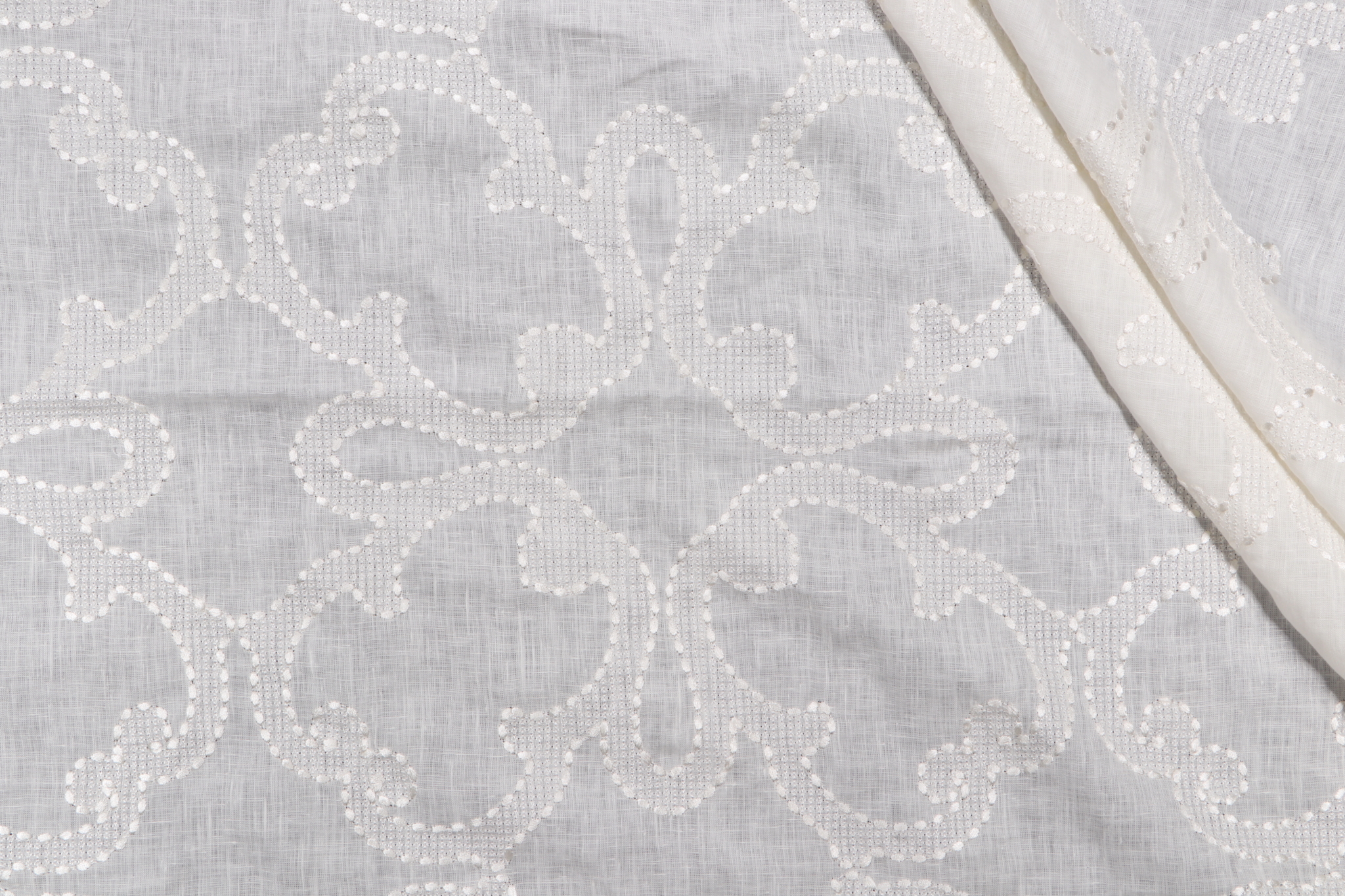 Thibaut Park Slope W764118 Sheer Embroidered Linen Drapery Fabric in White is a remnant. Fabric remnants refer to leftover pieces of fabric from production runs at manufacturing sites or pieces that remain from by the yard stock. The lengths of these remnants can vary from a few inches to several yards and are typically sold at a reduced price, since they represent remaining inventory.