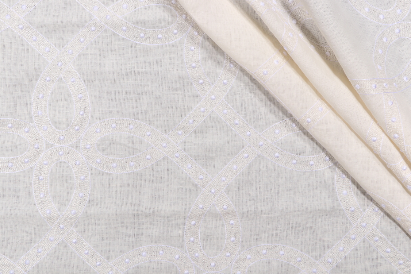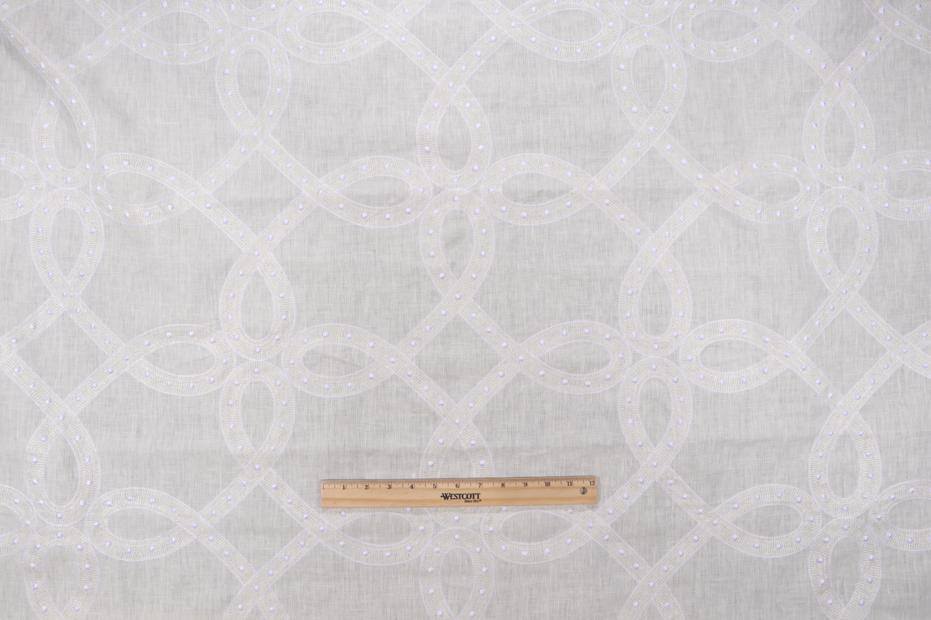 Thibaut Salina Ribbon AW1376 Sheer Embroidered Drapery Fabric in White is a remnant. Fabric remnants refer to leftover pieces of fabric from production runs at manufacturing sites or pieces that remain from by the yard stock. The lengths of these remnants can vary from a few inches to several yards and are typically sold at a reduced price, since they represent remaining inventory.