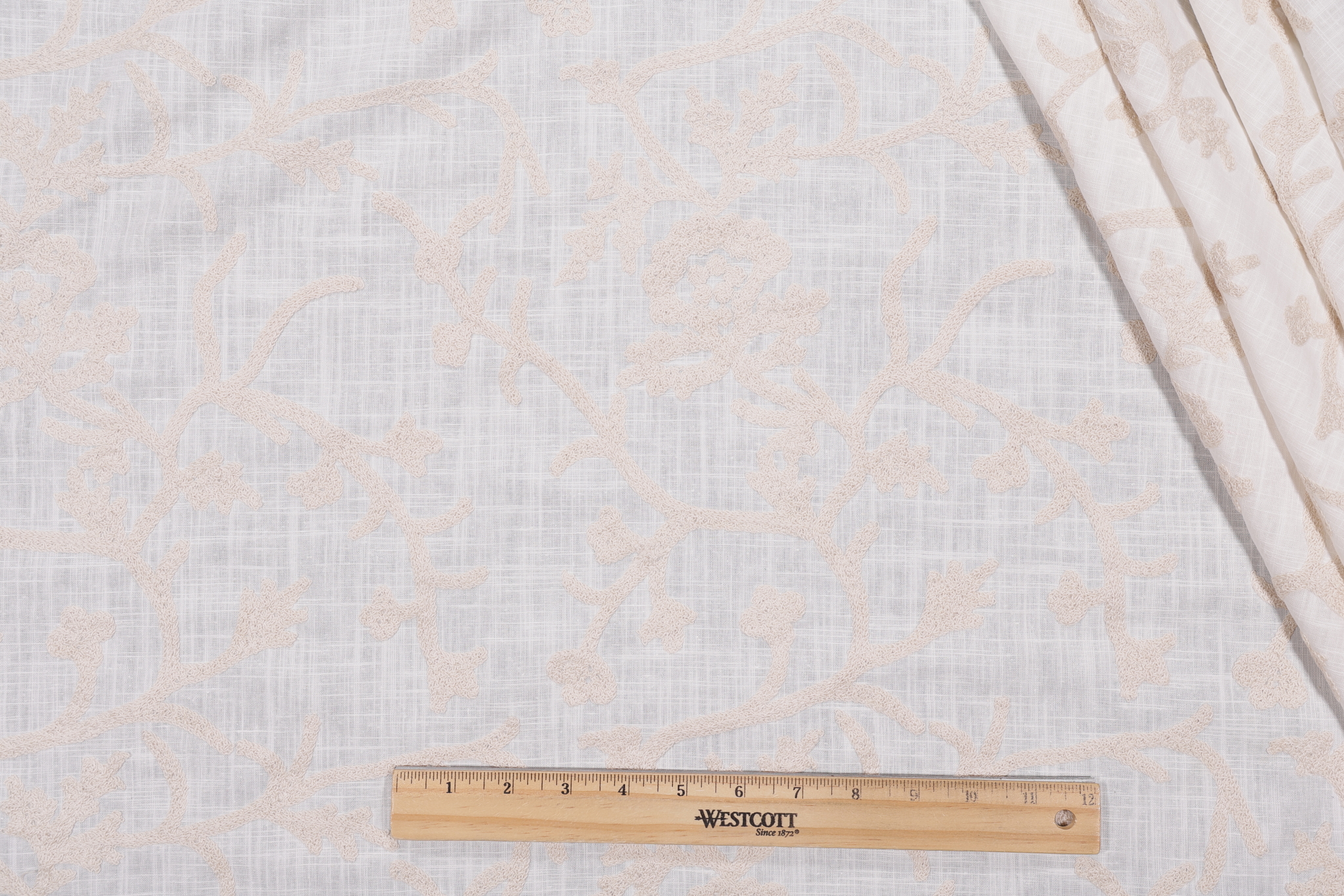 Whistler Semi-Sheer Embroidered Drapery Fabric in Snowflake is a remnant. Fabric remnants refer to leftover pieces of fabric from production runs at manufacturing sites or pieces that remain from by the yard stock. The lengths of these remnants can vary from a few inches to several yards and are typically sold at a reduced price, since they represent remaining inventory.