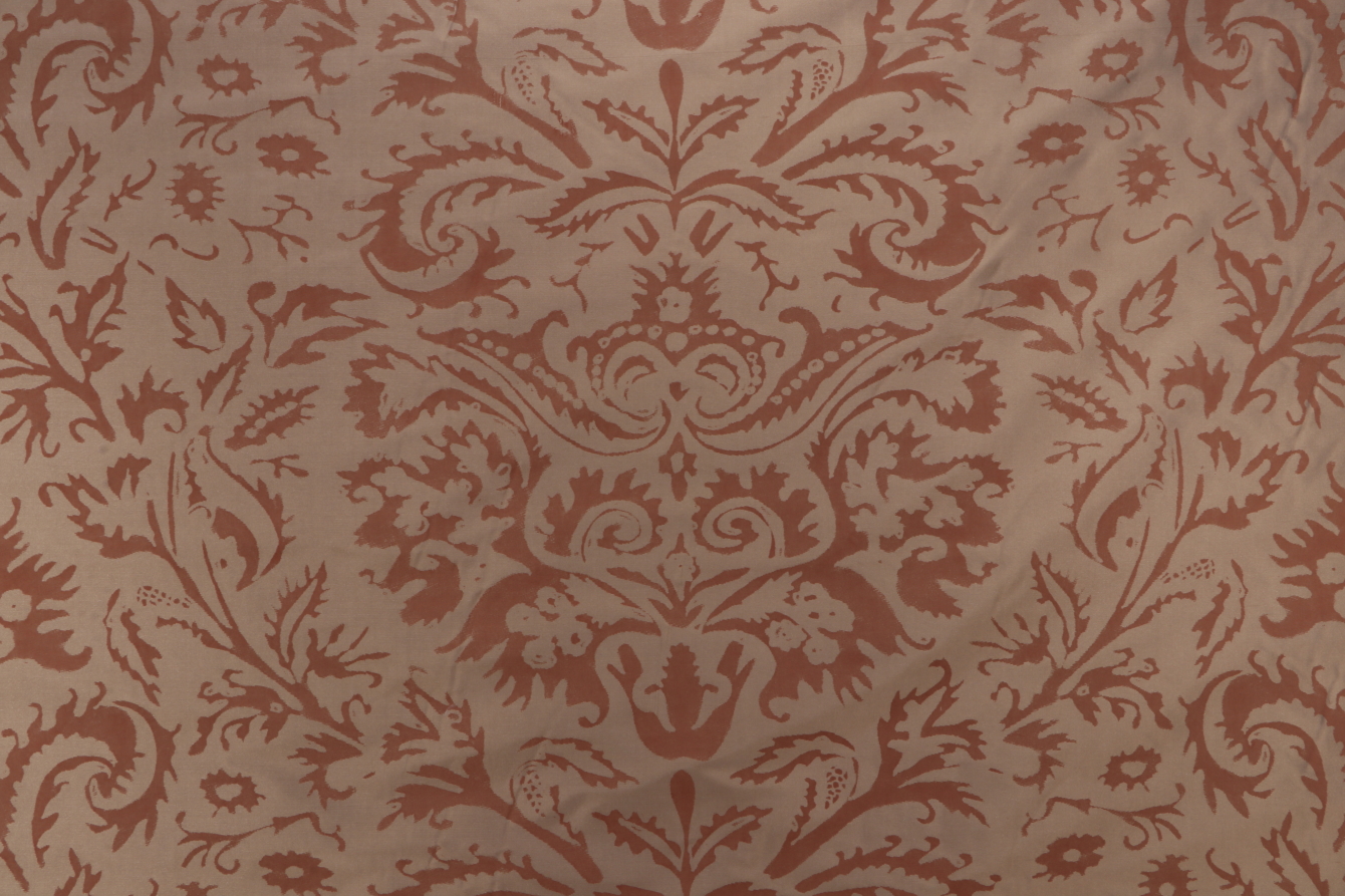 Scalamandre Alison Silk Printed Drapery Fabric is a remnant. Fabric remnants refer to leftover pieces of fabric from production runs at manufacturing sites or pieces that remain from by the yard stock. The lengths of these remnants can vary from a few inches to several yards and are typically sold at a reduced price, since they represent remaining inventory.