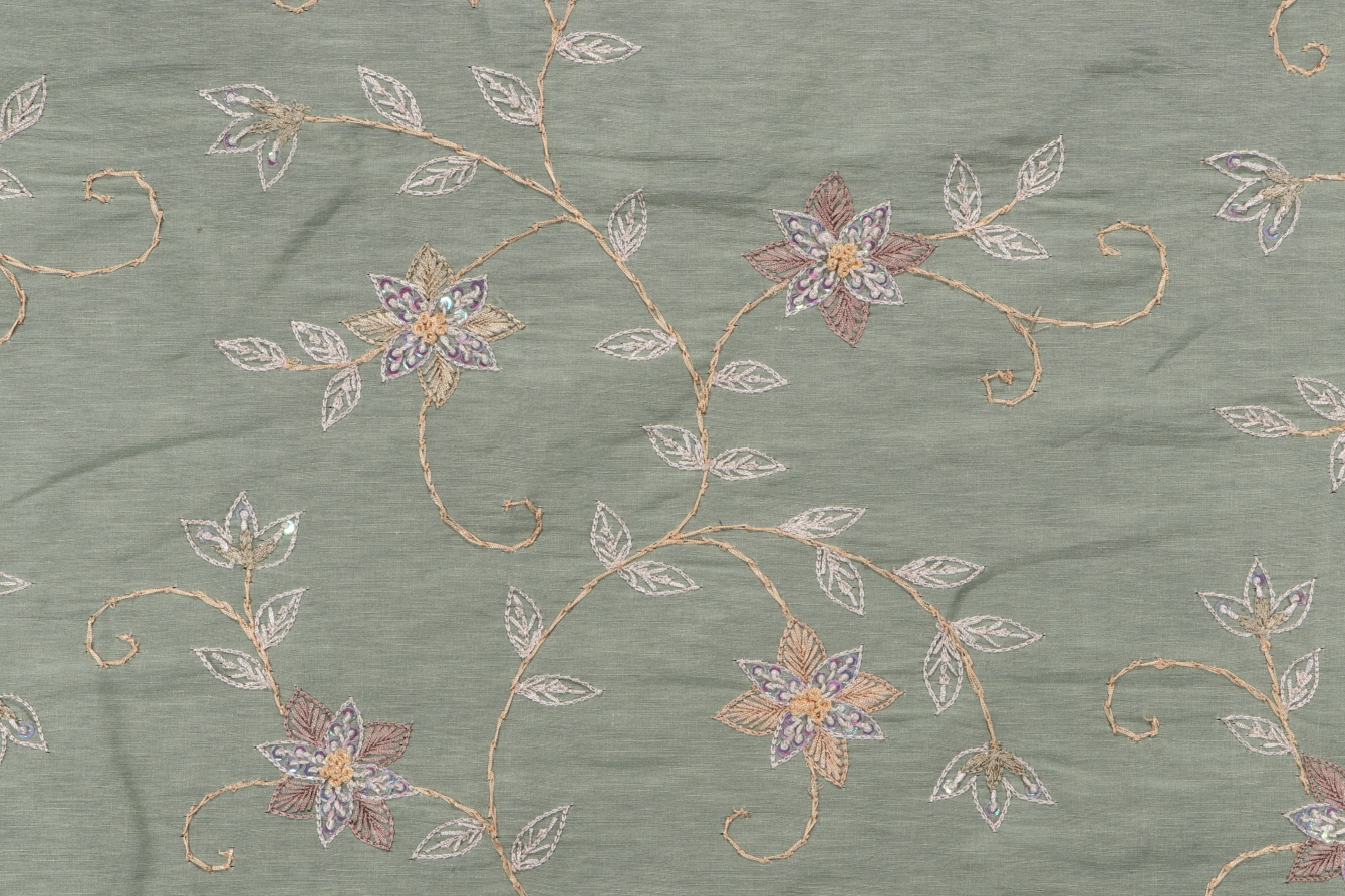 Scalamandre Pari Embroidered Silk Blend Decorator Fabric in Jade is a remnant, which is sold as a whole piece.