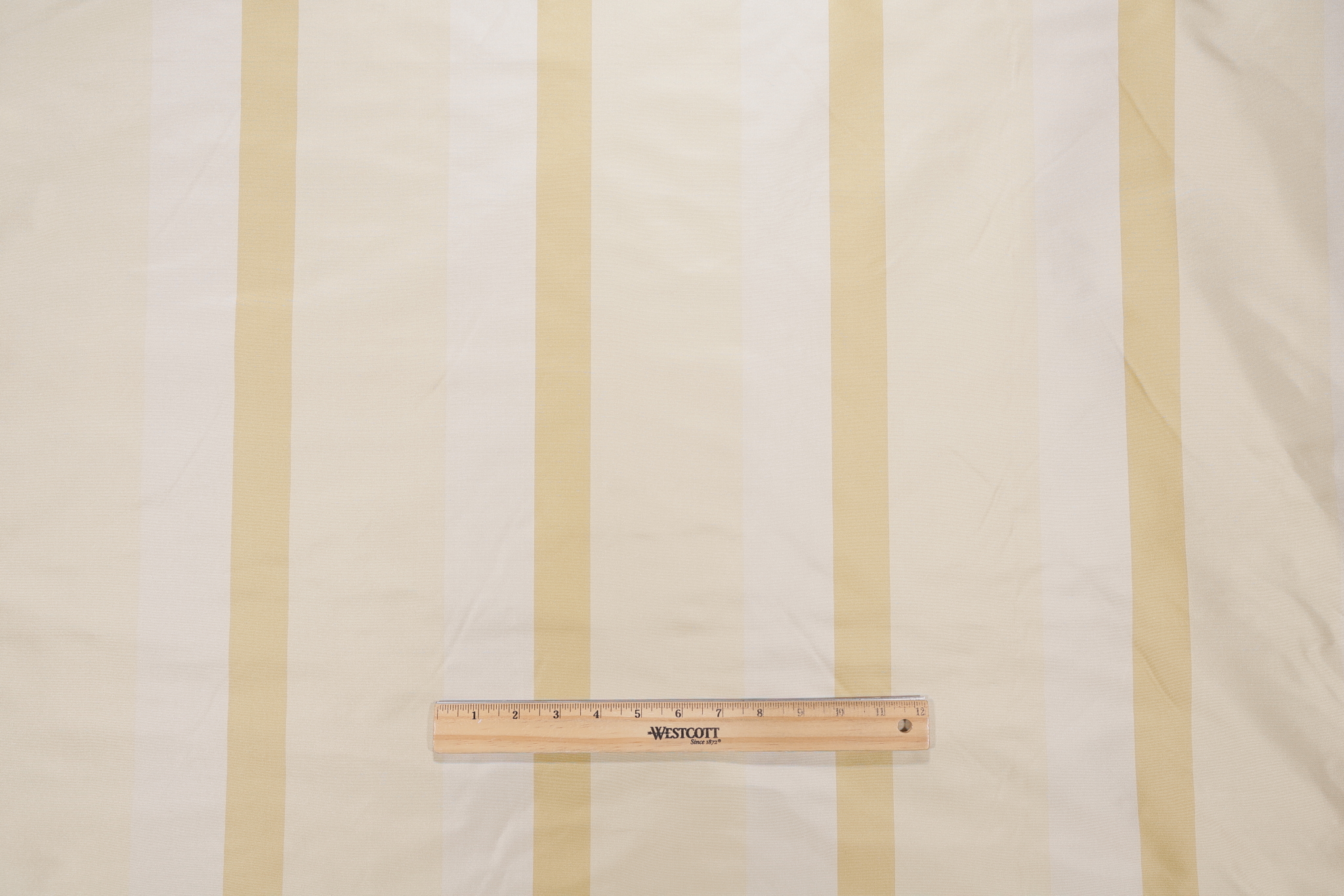 Scalamandre Sirneuse Stripe Silk Decorator Fabric in Cream/Gold is a remnant. Fabric remnants refer to leftover pieces of fabric from production runs at manufacturing sites or pieces that remain from by the yard stock. The lengths of these remnants can vary from a few inches to several yards and are typically sold at a reduced price, since they represent remaining inventory.