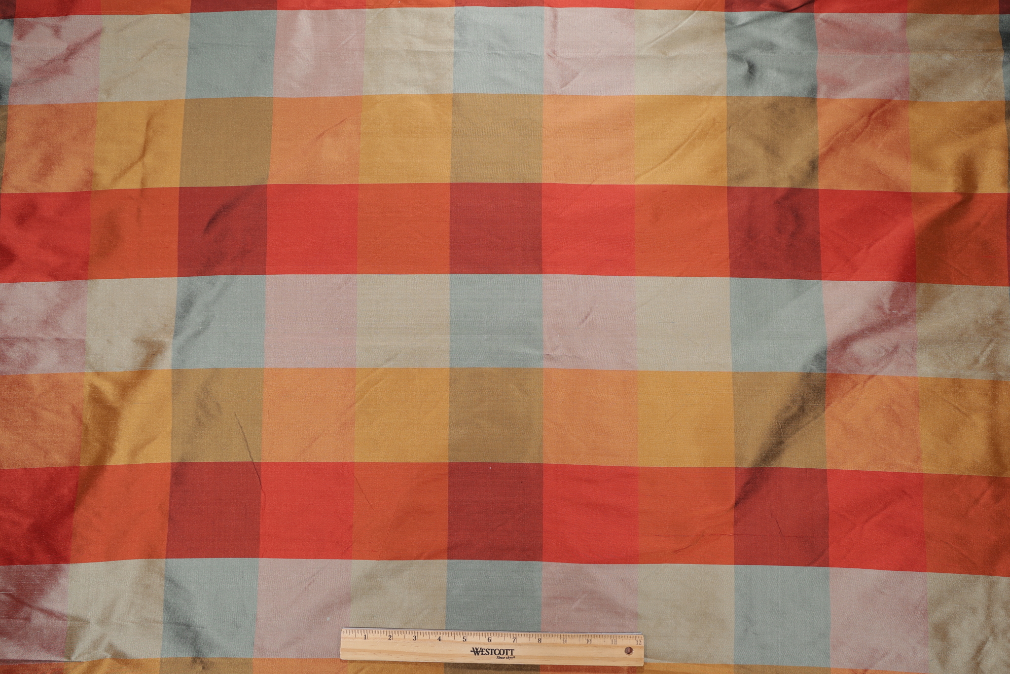 Scalamandre Smooth Plaid Silk Drapery Fabric in Fall is a remnant. Fabric remnants refer to leftover pieces of fabric from production runs at manufacturing sites or pieces that remain from by the yard stock. The lengths of these remnants can vary from a few inches to several yards and are typically sold at a reduced price, since they represent remaining inventory.