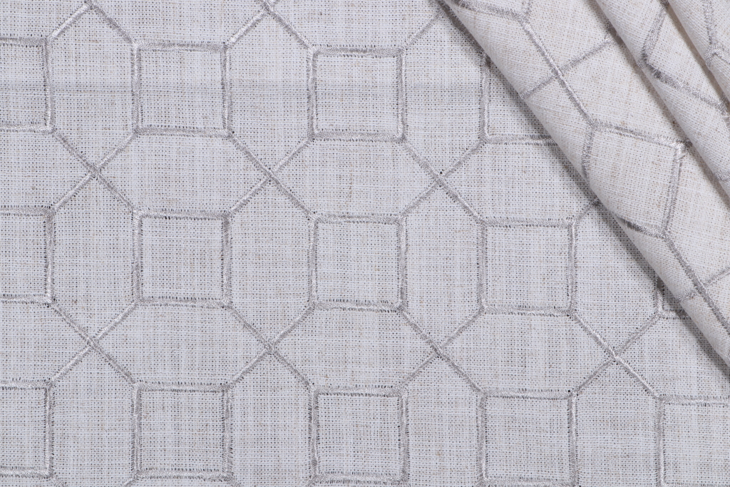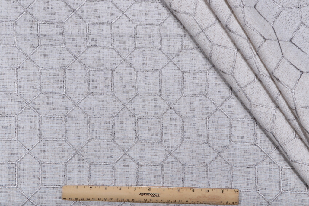 Octagon Trellis Embroidered Drapery Fabric in Silver is a remnant, which is sold as a whole piece.