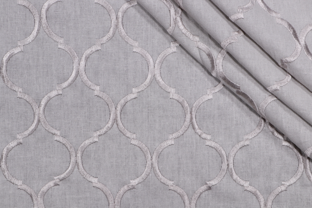 Richloom Ornella Embroidered Drapery Fabric in Silver is a remnant. Fabric remnants refer to leftover pieces of fabric from production runs at manufacturing sites or pieces that remain from by the yard stock. The lengths of these remnants can vary from a few inches to several yards and are typically sold at a reduced price, since they represent remaining inventory.