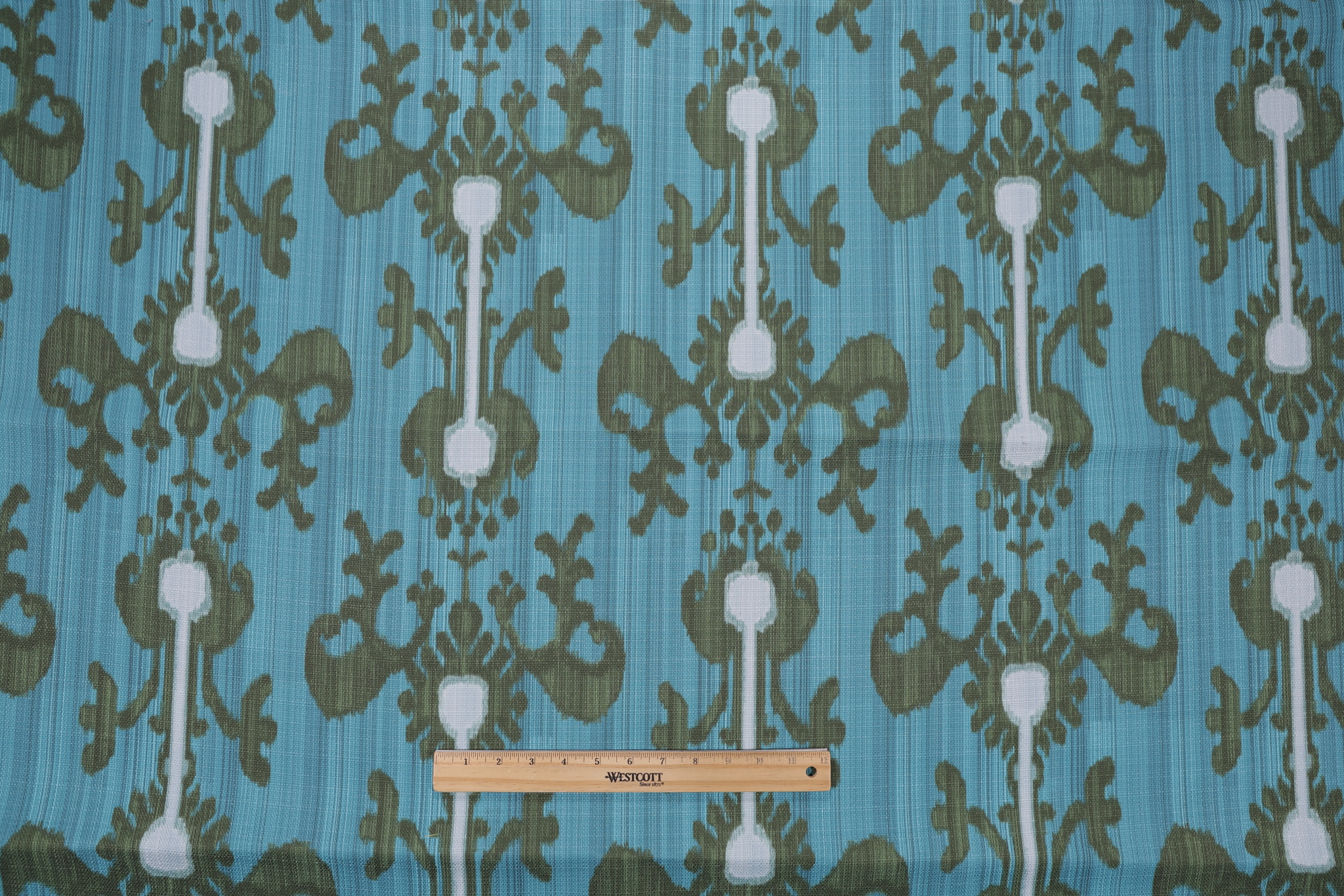 Retro Ikat Printed Outdoor Fabric in Sky is a remnant. Fabric remnants refer to leftover pieces of fabric from production runs at manufacturing sites or pieces that remain from by the yard stock. The lengths of these remnants can vary from a few inches to several yards and are typically sold at a reduced price, since they represent remaining inventory.