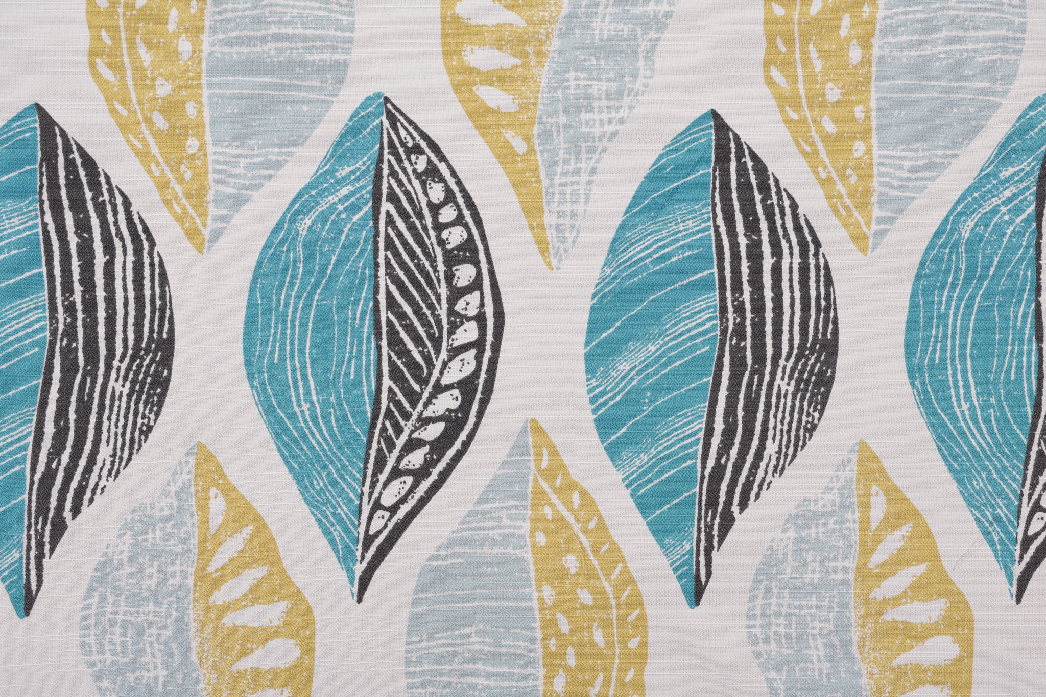 Robert Allen Leaf Block Printed Polyester Outdoor Fabric in Teal/Citron is a remnant. Fabric remnants refer to leftover pieces of fabric from production runs at manufacturing sites or pieces that remain from by the yard stock. The lengths of these remnants can vary from a few inches to several yards and are typically sold at a reduced price, since they represent remaining inventory.