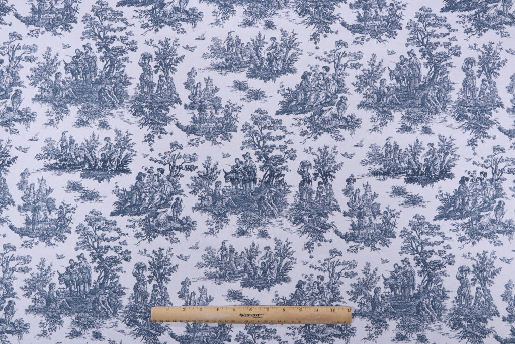 Premier Prints Jamestown Toile Printed Cotton Drapery Fabric in Premier Navy is a remnant, which is sold as a whole piece.