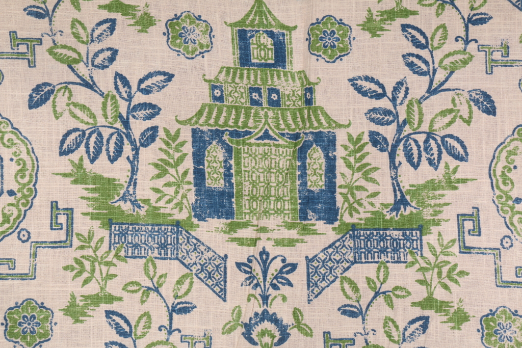 Richloom Teahouse Toile Printed Linen Blend Drapery Fabric in Kelly. This printed fabric is perfect for window treatments, decorative pillows, handbags, light duty upholstery applications and almost any craft project. This fabric has a soft workable feel yet is stable and durable.