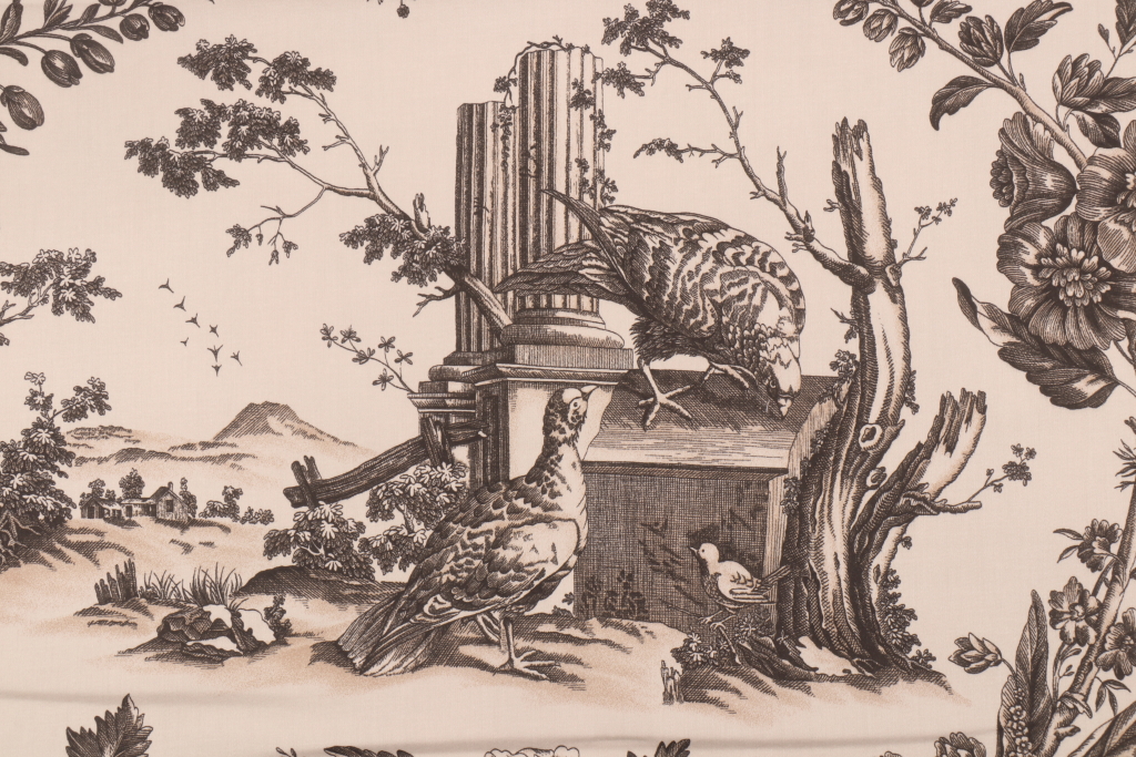 1 Yard Thibaut Pheasant Toile F96341 Printed Cotton Drapery Fabric in Black. This printed fabric is perfect for window treatments, decorative pillows, handbags, light duty upholstery applications and almost any craft project. This fabric has a soft workable feel yet is stable and durable.