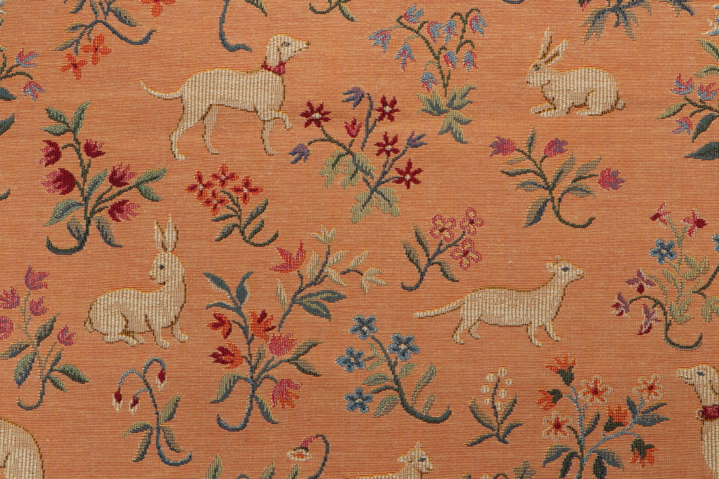 Old World Weavers Medieval Animals Tapestry Upholstery Fabric in Jaune is a remnant. Fabric remnants refer to leftover pieces of fabric from production runs at manufacturing sites or pieces that remain from by the yard stock. The lengths of these remnants can vary from a few inches to several yards and are typically sold at a reduced price, since they represent remaining inventory.