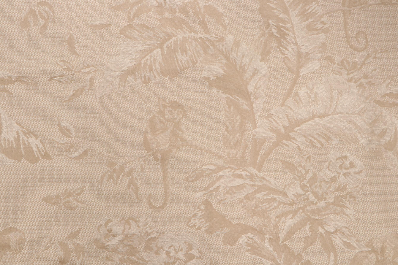 Scalamandre Les Singes Damask Upholstery Fabric in Beige is a remnant. Fabric remnants refer to leftover pieces of fabric from production runs at manufacturing sites or pieces that remain from by the yard stock. The lengths of these remnants can vary from a few inches to several yards and are typically sold at a reduced price, since they represent remaining inventory.