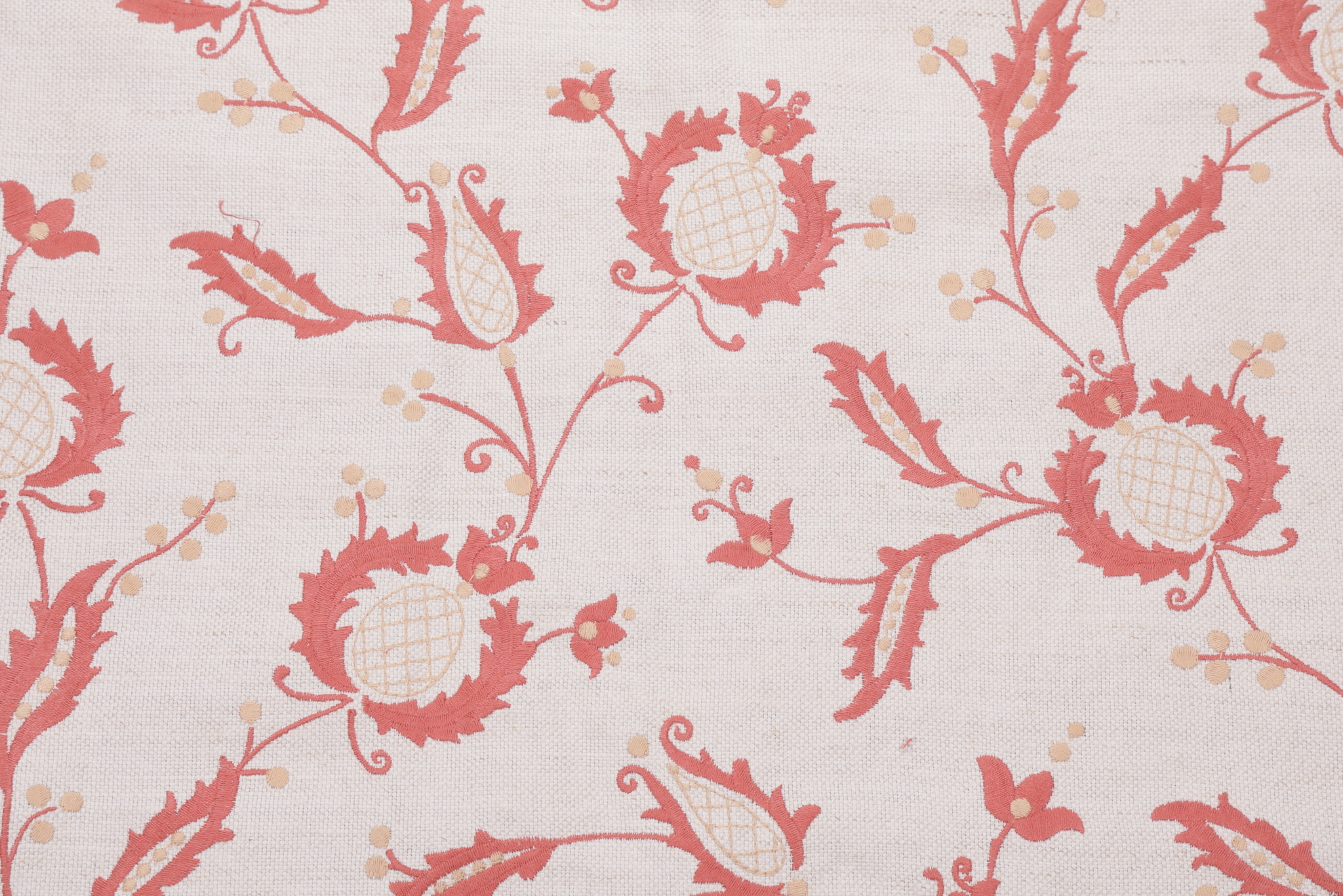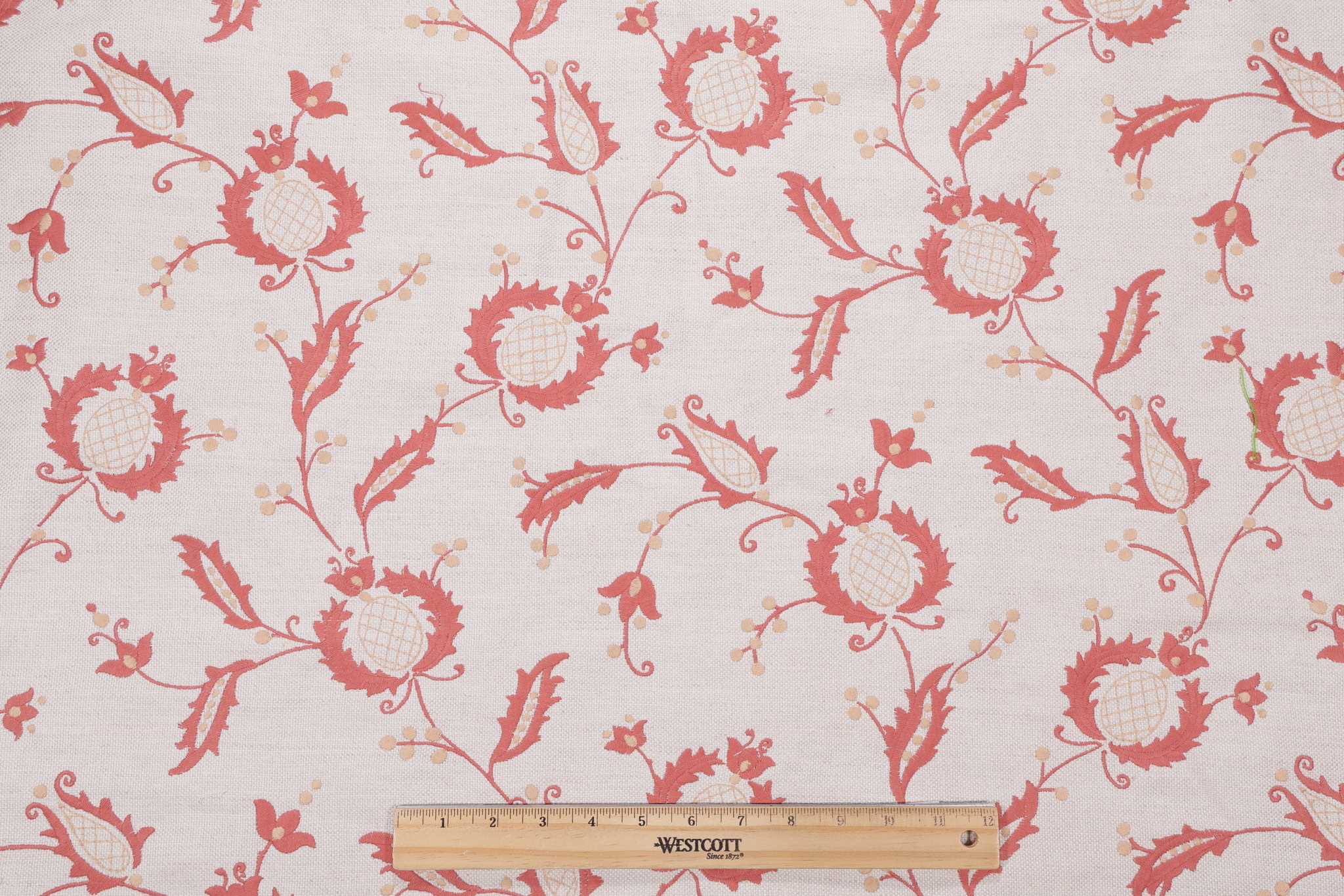 Fabricut Bosser Embroidered Drapery Fabric in Rouge is a remnant. Fabric remnants refer to leftover pieces of fabric from production runs at manufacturing sites or pieces that remain from by the yard stock. The lengths of these remnants can vary from a few inches to several yards and are typically sold at a reduced price, since they represent remaining inventory.
