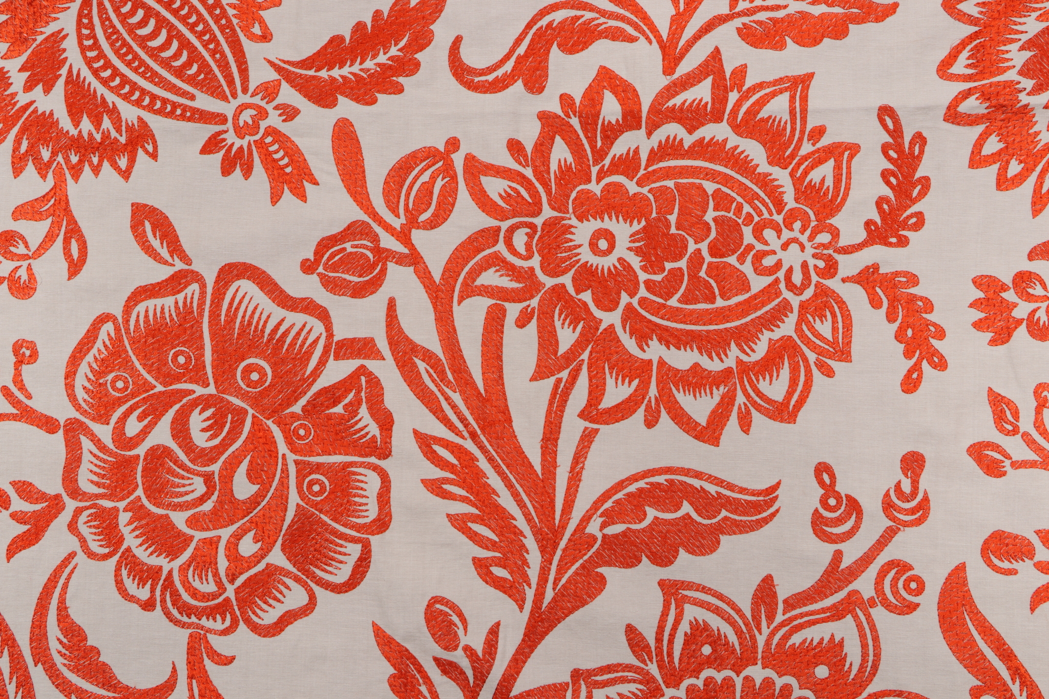 Thibaut Rivera W713047 Embroidered Drapery Fabric in Coral and Flax is a remnant. Fabric remnants refer to leftover pieces of fabric from production runs at manufacturing sites or pieces that remain from by the yard stock. The lengths of these remnants can vary from a few inches to several yards and are typically sold at a reduced price, since they represent remaining inventory.