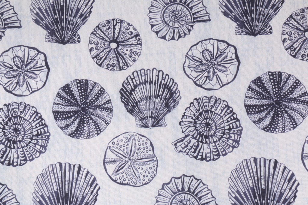 Terrasol - Seashell Printed Polyester Outdoor Fabric in Marine. This printed indoor/outdoor fabric is perfect for any project where the fabric will be exposed to the weather. Uses include cushions, tablecloths, upholstery projects, decorative pillows and craft projects. This fabric has a slightly stiff feel but is easy to work with.