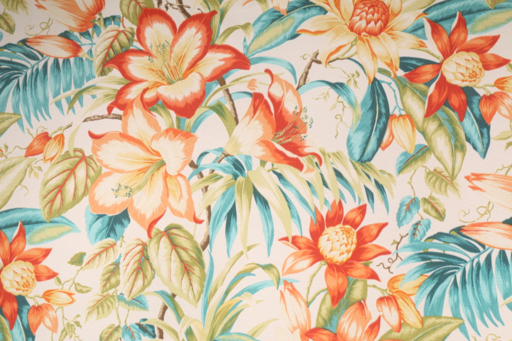 Tommy Bahama Botanical Glow Printed Polyester Outdoor Fabric in Tiger Lily. This printed indoor/outdoor fabric is perfect for any project where the fabric will be exposed to the weather. Uses include cushions, tablecloths, upholstery projects, decorative pillows and craft projects. This fabric has a slightly stiff feel but is easy to work with.