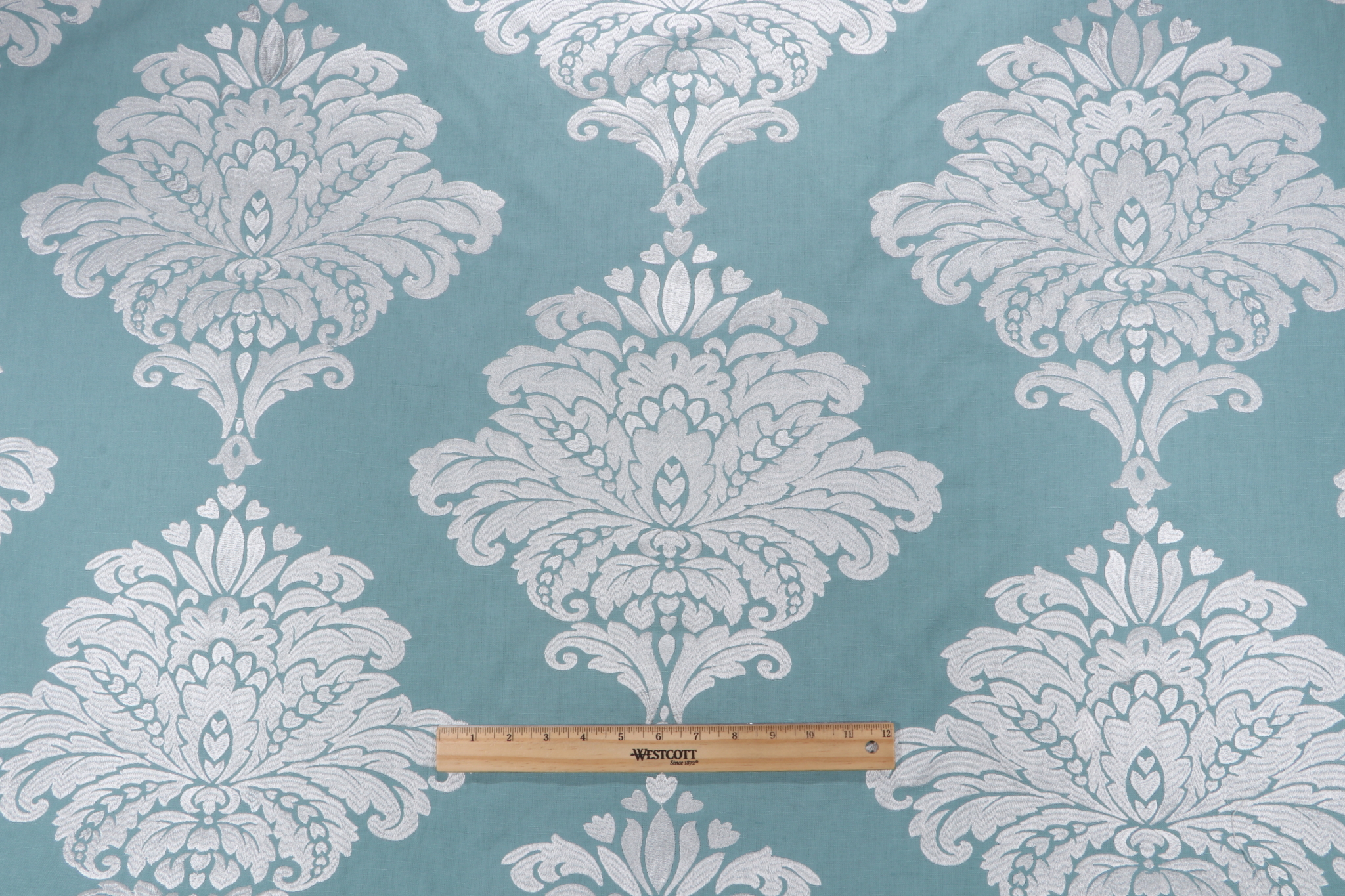 Thibaut Arturo Damask W713015 Embroidered Drapery Fabric in White on Turquoise is a remnant, which is sold as a whole piece.