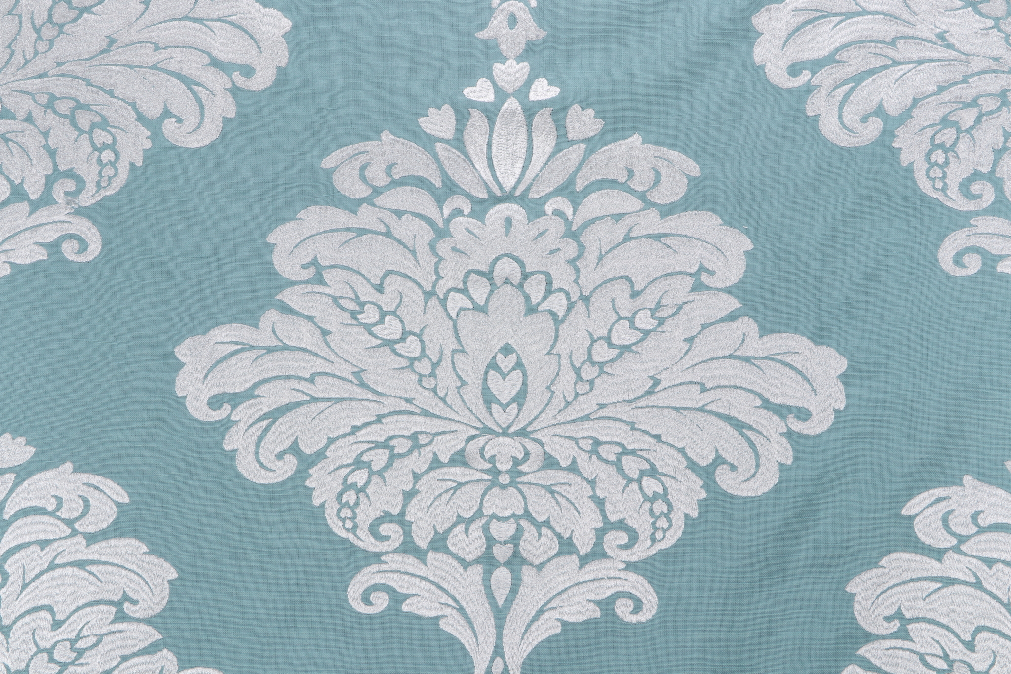 Thibaut Arturo Damask W713015 Embroidered Drapery Fabric in White on Turquoise is a remnant. Fabric remnants refer to leftover pieces of fabric from production runs at manufacturing sites or pieces that remain from by the yard stock. The lengths of these remnants can vary from a few inches to several yards and are typically sold at a reduced price, since they represent remaining inventory.