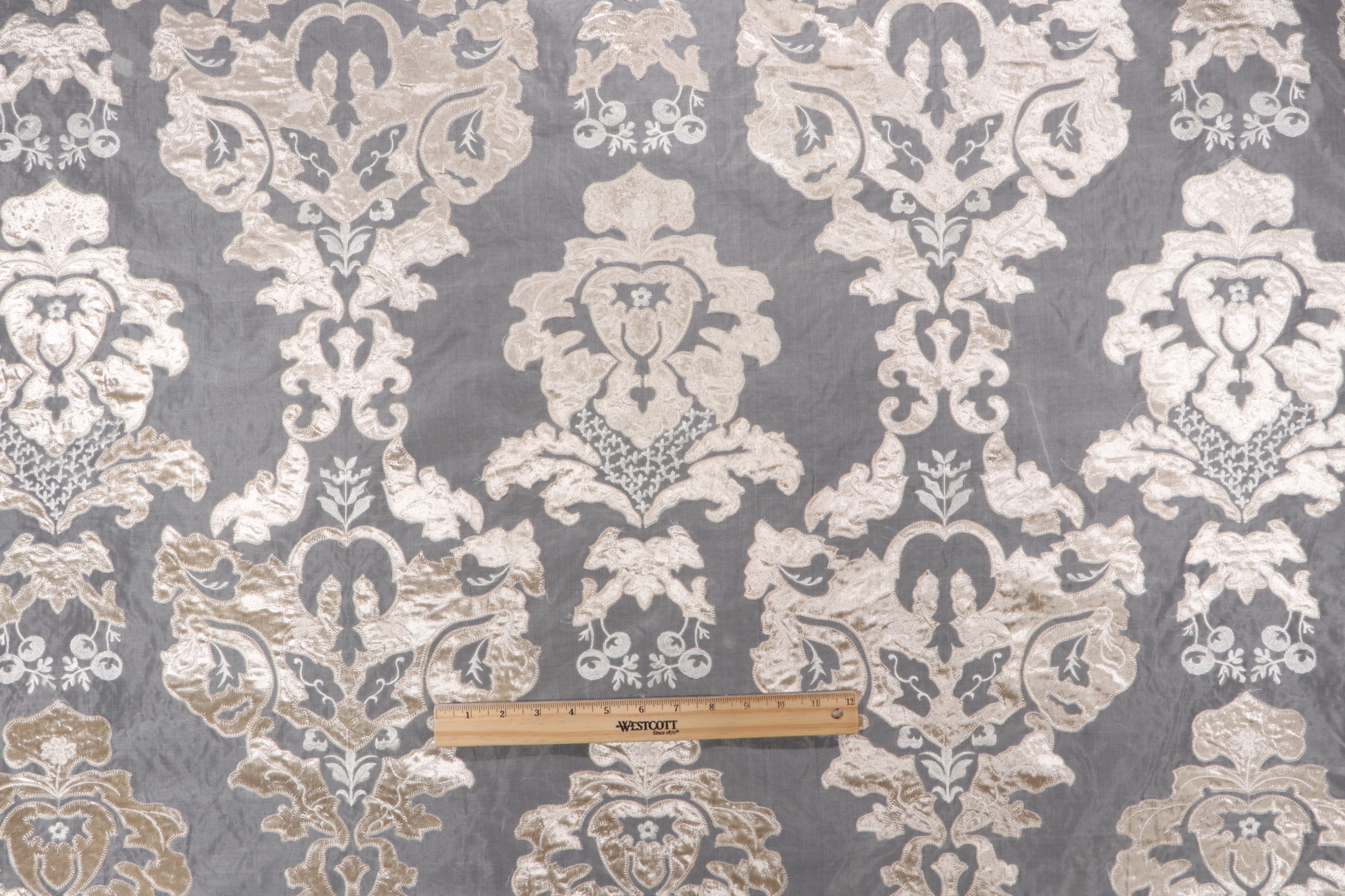 Available now: 9.25 yards of Palazzo Ricci, a premium sheer embroidered silk velvet drapery fabric by Scalamandre. This fabric is well-suited for upholstering a single tufted accent chair, a cushioned ottoman, or a pair of decorative pillow shams. It can also be used for a high-end handbag or an elegant fabric headboard panel. Scalamandre is a heritage brand known for its opulent textiles, frequently featured in luxury estates, historic restorations, and high-end interior design projects. Gray, silver, dark gray, gainsboro, and light gray lend an understated elegance, making this fabric a versatile choice. Note: If you are unsure about the suitability of this fabric for your specific use case please contact us prior to ordering.