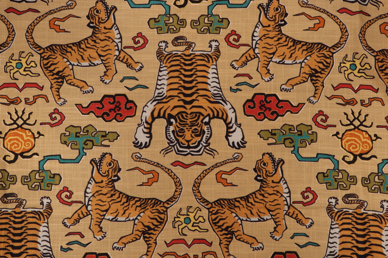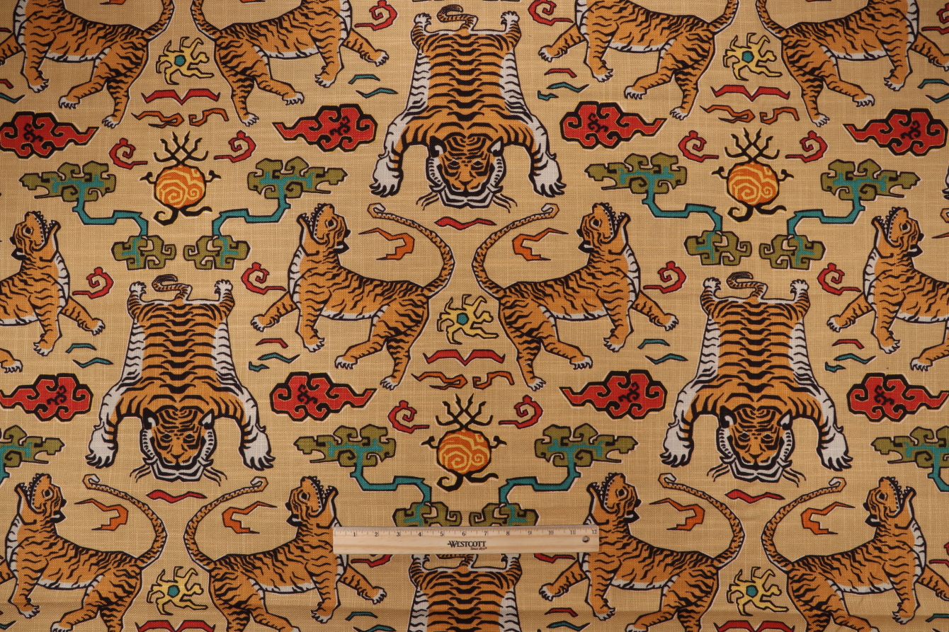 Tiger Republic in 380-Saffron from Hilary Farr for Covington delivers statement-making pattern and saturated color on a smooth, cotton-blend base cloth. The design spotlights boldly rendered tigers with inky black outlines and warm amber striping, arranged in a mirrored, multi-directional layout that creates a striking rhythm across the cloth. A golden saffron ground sets the stage for layered accent tones; brick red, teal, jade, olive, and soft white; adding depth without overpowering the composition. Stylized cloud-scrolls and small symbolic motifs punctuate the spaces between the cats, giving the print an artful, Eastern-inspired sensibility. The printing is crisp, with clear registration that defines each stripe and curve, and the ground shows a subtle, linen-like crosshatch that lends quiet texture behind the artwork. Scaled for impact, the repeat reads as bold and graphic from a distance and reveals intricate linework up close. This is a distinctive, conversation-starting print crafted to bring color, pattern, and personality to any setting.