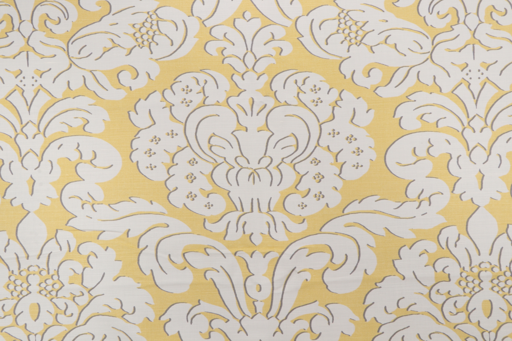 Thibaut Trelawny Damask F914216 Printed Linen Blend Drapery Fabric in Yellow is a remnant. Fabric remnants refer to leftover pieces of fabric from production runs at manufacturing sites or pieces that remain from by the yard stock. The lengths of these remnants can vary from a few inches to several yards and are typically sold at a reduced price, since they represent remaining inventory.