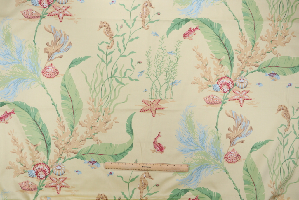 Thibaut Tidal Pool F96702 Printed Drapery Fabric in Yellow is a remnant. Fabric remnants refer to leftover pieces of fabric from production runs at manufacturing sites or pieces that remain from by the yard stock. The lengths of these remnants can vary from a few inches to several yards and are typically sold at a reduced price, since they represent remaining inventory.